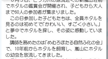 ピウカ川にホタルが住みついているか、ホタルを探しに川を探索する。川でのホタル探索の他に、川の自然観察、植物観察などを行い、どのような場所にホタルが住み着き、卵を産むのか等、ホタルの生態について学習を行う。その後、実際にホタルが展示されている国民宿舎ロビーでホタルの観賞を行う。ホタルを見ながら、昔の嵐山の様子や自然環境を説明し、川をきれいに保っていかなければならないという講話も含めて説明をする。