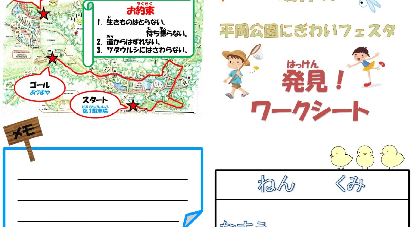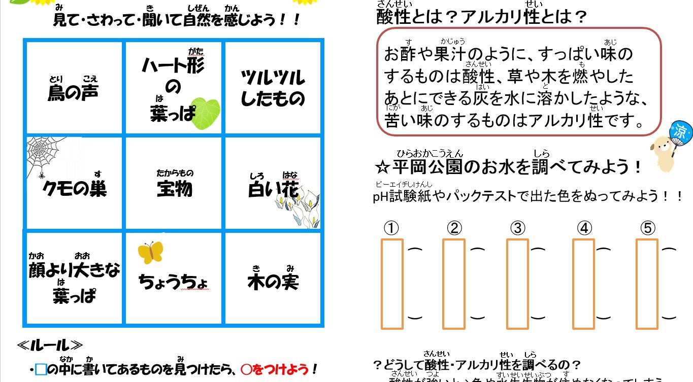 対象は地域の小学生とその保護者としてチラシを作成し(別紙1)、平岡公園管理事務所と平岡どんぐりの森の協力のもと、公園管理事務所のロビーへの設置や近隣の小学校への配布を行った。事業の内容としては当初、平岡公園の池や湿地、流入出する河川で生息する水生生物や水質について、専門家を招き野外学習形式で学ぶという内容であった。しかし夏休みにぎわい隊との話し合いの結果、昨年まで の参加者の年齢層や人数の多さを参考に内容を以下のように変更し実施した。