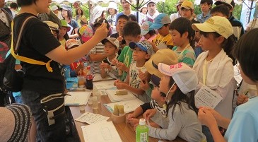 水質の測り方を知り、生き物の棲める水や棲めない水、飲める水、飲めない水があることを学ぶため公園内の水質をパックテストによって計測した(写真3)。計測する水はスタッフが事前に公園内の3ヶ所から採水し、参加者はパックテストを1人1つ持ち、3つの水のうち1つの水質を調べた。パックテス トの結果はワークシートに色鉛筆で記録してもらい、公園内の水質について説明をした。説明等は水質調査を主としている学生スタッフが担当した。なお内容の難しさと参加者の理解度を加味して、水の調査は基本的に小学校3年生以上を対象とし、それ以下の子どもはカエルとふれあいのコーナーに参加してもらった。