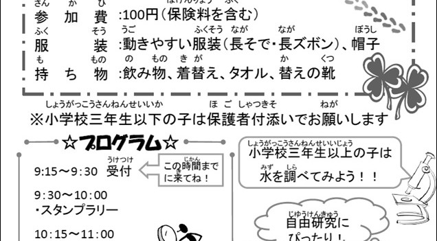 夏休みの自由研究を意識し、水を中心に取り巻く自然やそこに生息する生き物、水そのものについて 調べることの大切さやその必要性、「研究」とは何かについての入り口を体験することを目的とした。