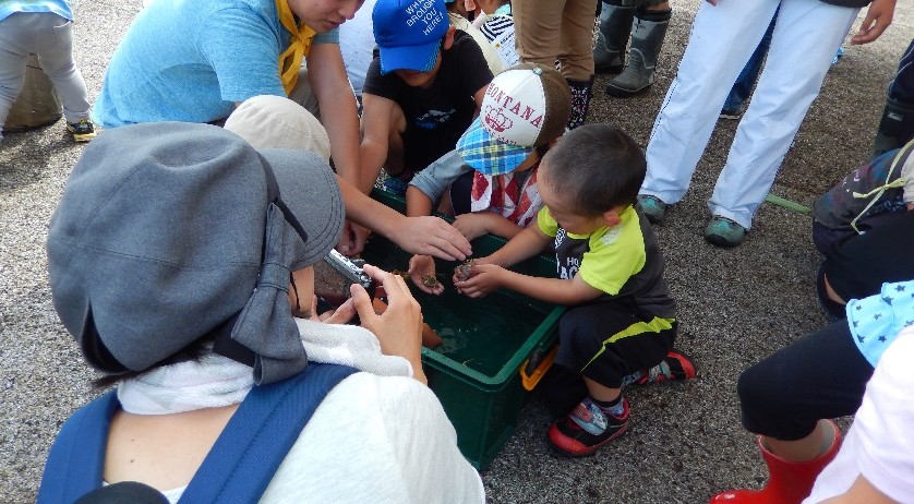 公園に生息する外来種のカエルであるトノサマガエルについて知り、なぜ外来種が生息するのか、どの ようなカエルなのかについて学んでもらうことを目的とした。学生スタッフによるトノサマガエルに関するレクチャーの後、たらいに浮かべたカエルとの触れ合いの時間を設けた(写真4)。触れ合いを通 して子ども達には生き物への興味を持たせ、保護者には外来種の多くの原因となるペットの放棄につい て知ってもらうきっかけ作りとなった。