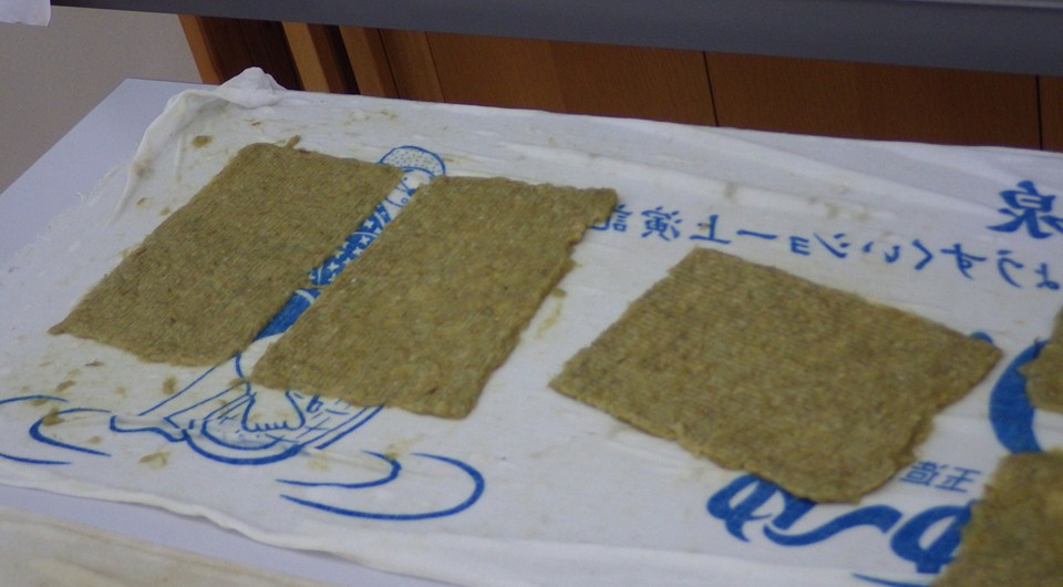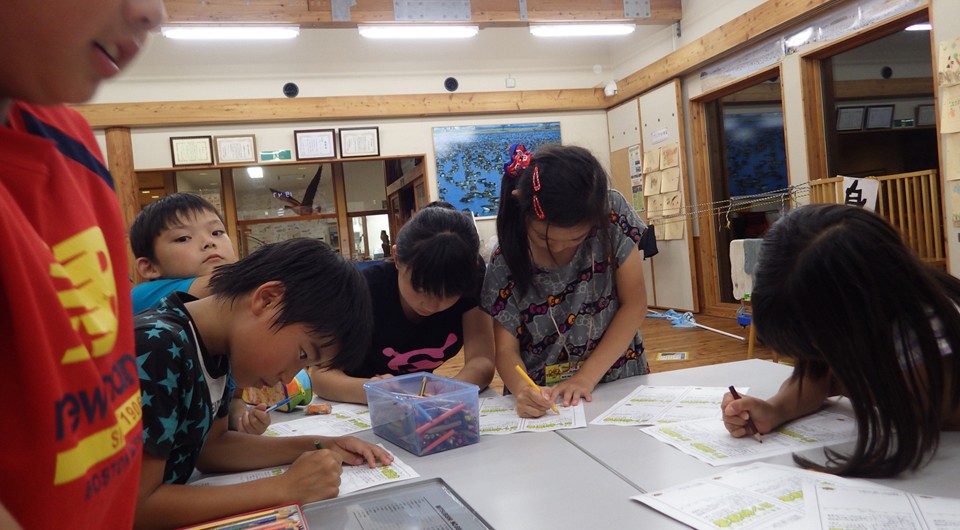 6月の活動で刈り取ったヨシを利用し、ヨシ紙作りを実施した。この活動は「ヨシは富栄養化している 宮島沼の水を浄化してくれる植物であり、成長したヨシを刈り取ることで宮島沼の水質保全になる」ということを楽しみながら理解できることがポイントである。また、手作りしたヨシ絵葉書を宮島沼カン トリーフェス(農業祭り)でマガレンジャー自身が販売することで、宮島沼の水質保全の普及とマガレンジャー活動資金調達を子どもたち自身で体験できる活動でもある。昨年から始めた活動のため、今まで実施したことのある隊員が中心となり、新しいメンバーに教えながらヨシ紙作りを実施することができた。
