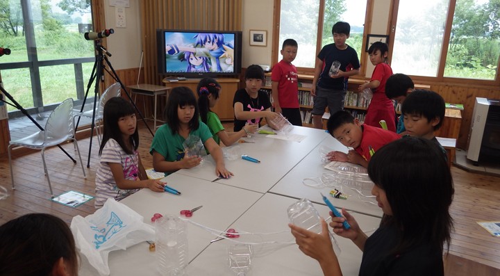 2リットルのペットボトルを使って「どう」を手作りした。5チームに分かれ、計10個のワナを宮島 沼の各所に設置し、翌朝回収した。成果は「モツゴ5匹」のみであった。ワナの作り方、ワナの設置方 法など検討の余地はあるが、8月の宮島沼では、あまり魚が捕獲できないことを確認した。