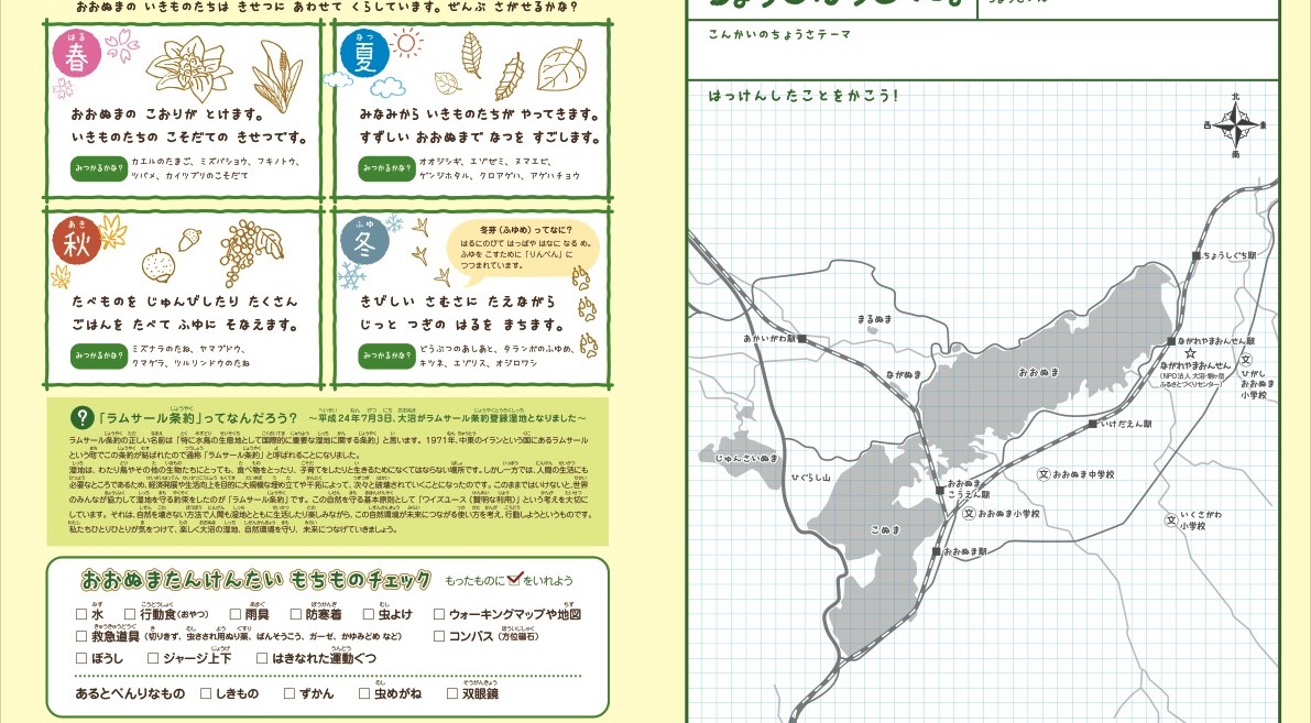 大沼ふるさとの森自然学校(東大沼地区)を拠点に、北海道教育大学教育学部等の学生も参加し合計26名で大沼地域の自然体験活動を行った。7月に予定していた活動が荒天により中止となったため同時開催となった。 大沼地域の湿地帯、山林地帯に生息する生き物の生態(つながり)などをイメージしてもらうため、ネイチャーマップ「沼のいきものたち」(添付資料)を活用し、湿原の成り立ち、なぜ湿原がこれら生き物にとって重要な場所であるかを個々に考えた。食べ物を得るため、敵から襲われることが少なくゆ っくり休めるため、子どもを育てるため等の意見を交換するなかで徐々に自然環境に関する理解を活動前に深めることができた。また、このネイチャーマップの特徴として、自分が発見したことを書き込める記載式マップとしていることである。ただ、マップ(資料等)に書いてあることを覚えることではなく、自分で調べたことを記録し、伝える(発表できる)ことで、大沼の自然環境について主体的に取り組むというねらいがある。自分で観察し、記録することで自分だけのオリジナルマップができる面白さもある。