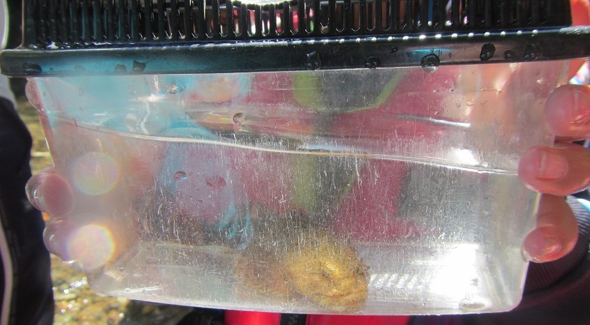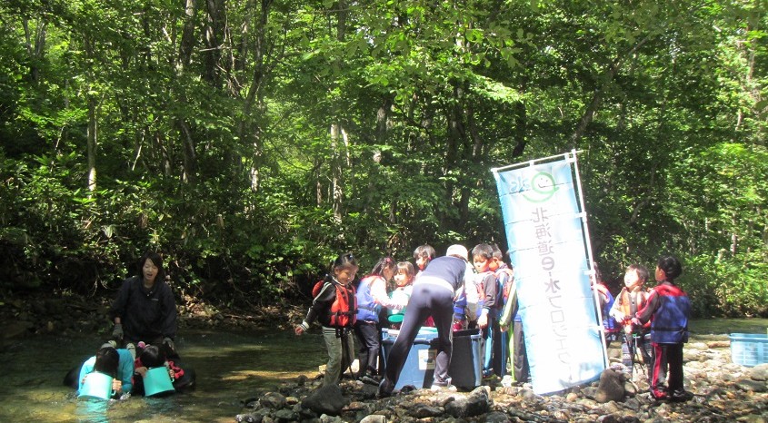 札幌市西区平和の子どもの森ポラーノ及び平和湖(琴似発寒川上流)での水生生物観察会を実施しまし た。西区内の保育園の年長さん21名と、保育園の先生6名、計27名の方々が元気に参加してくれました。前日までの雨で、少し増水気味の川でしたが、チューブに乗って川を流れながらの水中観察や、ハナカジカやフクドジョウなどを網で捕まえての生き物観察、ライフジャケットを着けての川流れなど、冷たい水にも負けず、みんな元気に活動していました。特に今回は、ハナカジカの小さな稚魚も観察することができ、「ハナカジカが子育てをするようなとてもきれいな川をいつまでも大切にしようね。」 といったお話を子ども達にすることも出来ました。最後は、井戸水を薪で沸かしたドラム缶風呂に入っ て冷えた体を温めてからお弁当を食べて終了となりました。