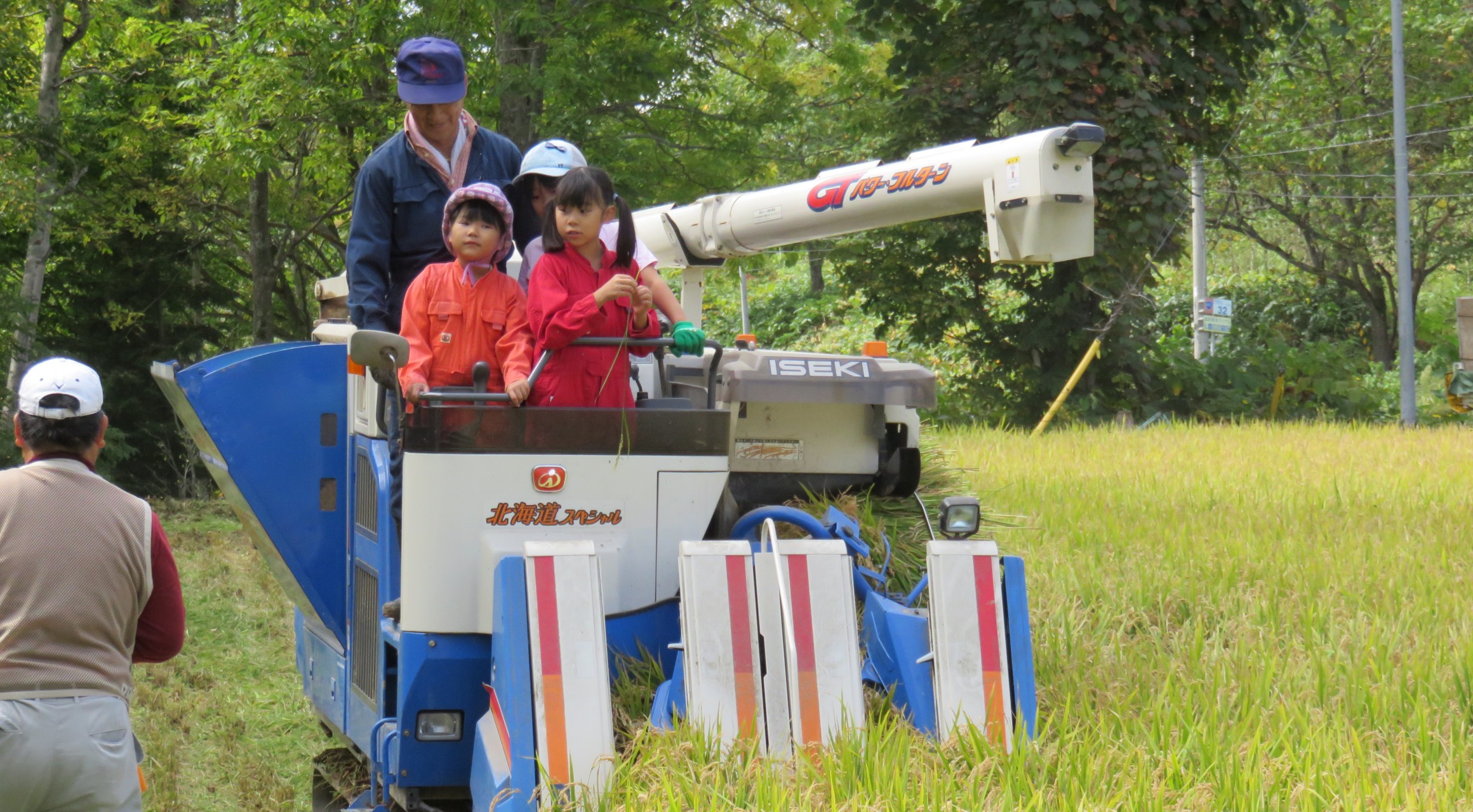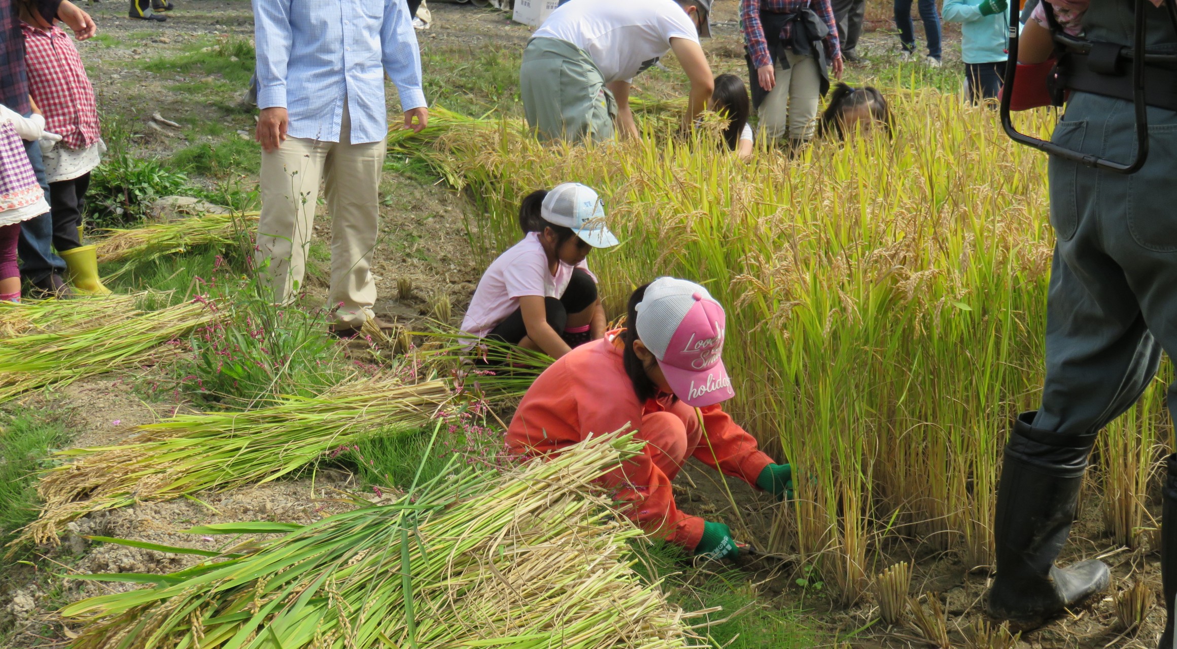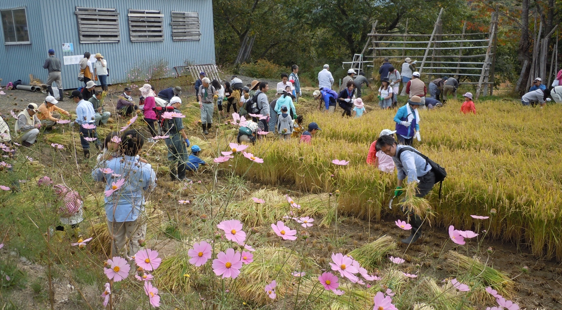 お米がどうして主食になったのか、木の成長を阻む冬の気候、稲刈りではなぜノコギリと同じよ うな刃のついたカマを使うのかと予習をしてから、春は代掻きを終えて水を張った田んぼへ、秋の 稲刈りではこがね色した稲穂の中に入っていきました。 春、初めて入る田んぼに目をみはり、そしてすぐ、真っ直ぐ植える難しさを知ります。秋、ノコ ギリカマで刈った稲を抱えてハサかけしている場所に運ぶ。初めて取り組む子供達と、前の年に経 験して少し自信を持った子供達が一緒になって体験しています。