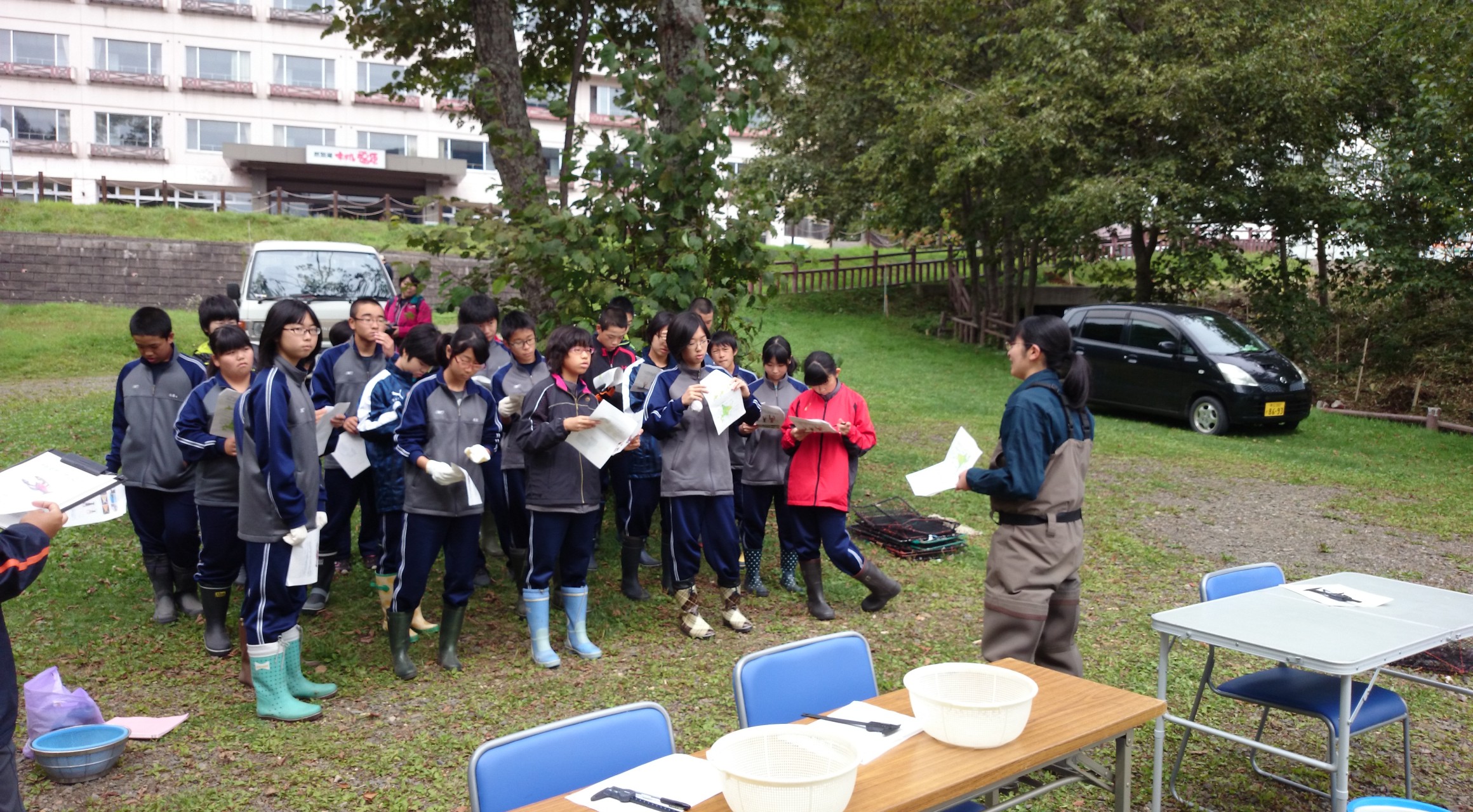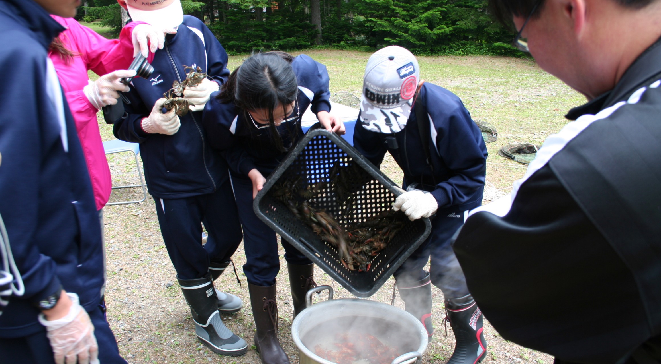 環境学習ではウチダザリガニに対する啓発を目的に、町内の中学校・高校の2年生を対象に7月 に瓜幕中学校・鹿追高等学校、9月に鹿追中学校の生徒を対象に実施しました。参加人数は瓜幕中 学校10名、鹿追中学校52名、鹿追高等学校75名の計137名で、協議会メンバーである伊藤・ 丸山・鈴木の指導の下、実際に仕掛けた捕獲用籠を回収し、捕獲したザリガニの計測や雌雄判別を 行ったのち、茹でて試食しました。生徒達からは、こんなに生息していると思わなかった、処分す るなんて可哀そう、美味しくないと思っていたが、実際食べてみたら美味しかった等いろいろな意 見がありました。
