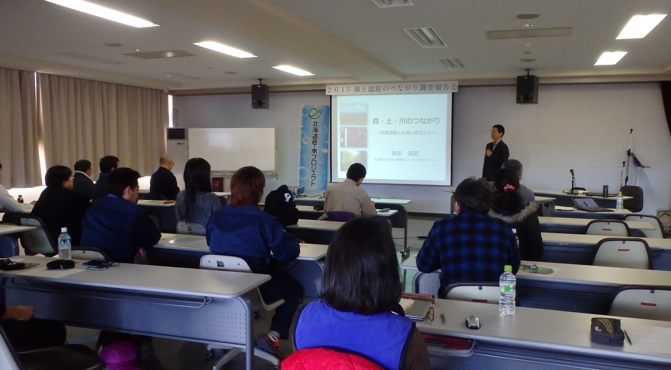 これまでの調査内容を町民にお知らせするため、11 月 28 日に「2015 海と湿原のつながり調査 報告会」を実施した。基調講演には北海道大学北方生物圏フィールド科学センターの柴田英昭氏を お招きした。また、昨年まで野外調査にご協力いただいた長坂晶子氏、有氏に講演をお願いした。 北海道大学の巴シン氏から安定同位体の分析結果について、また、当団体からはアマモウォッチの 結果について報告を行った