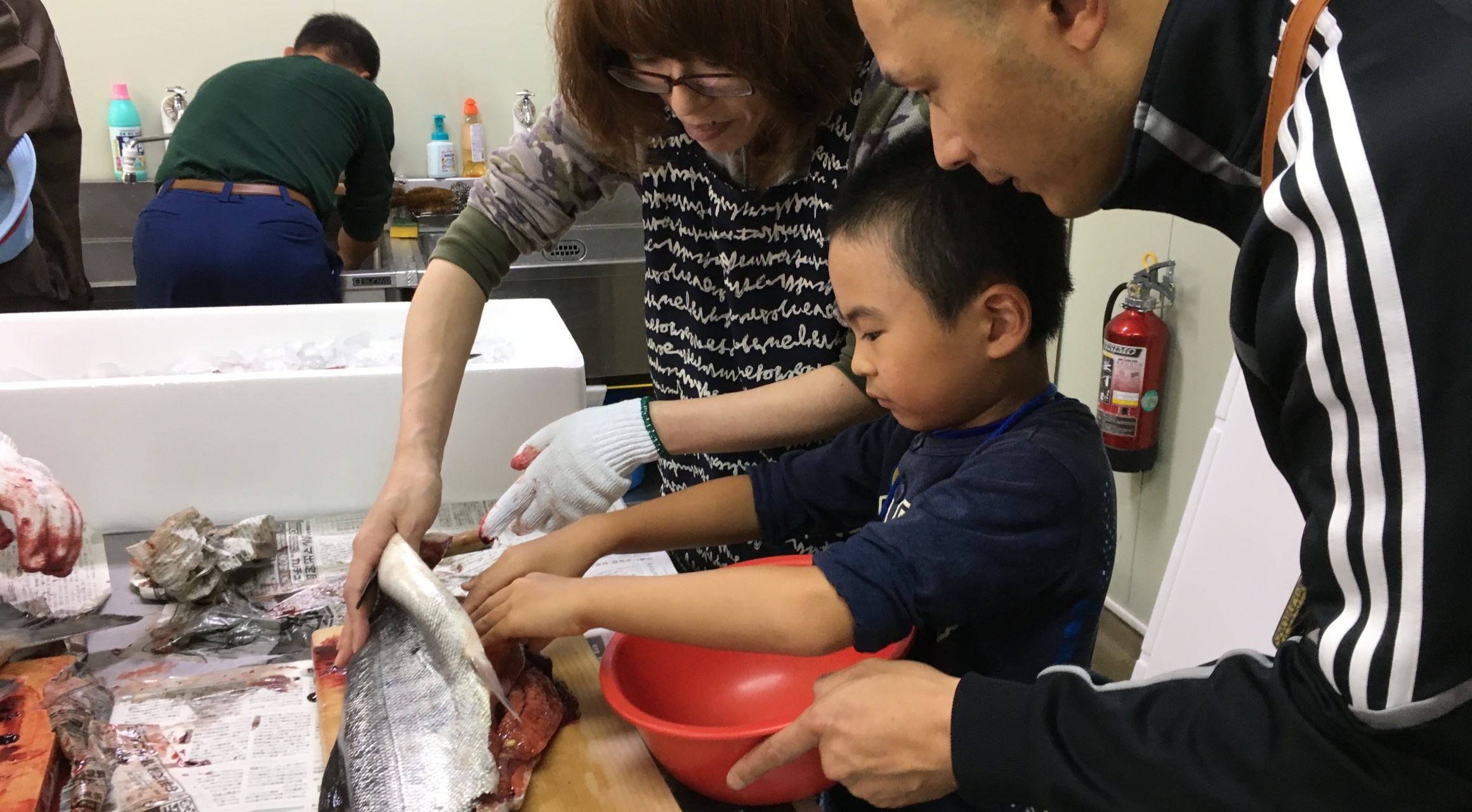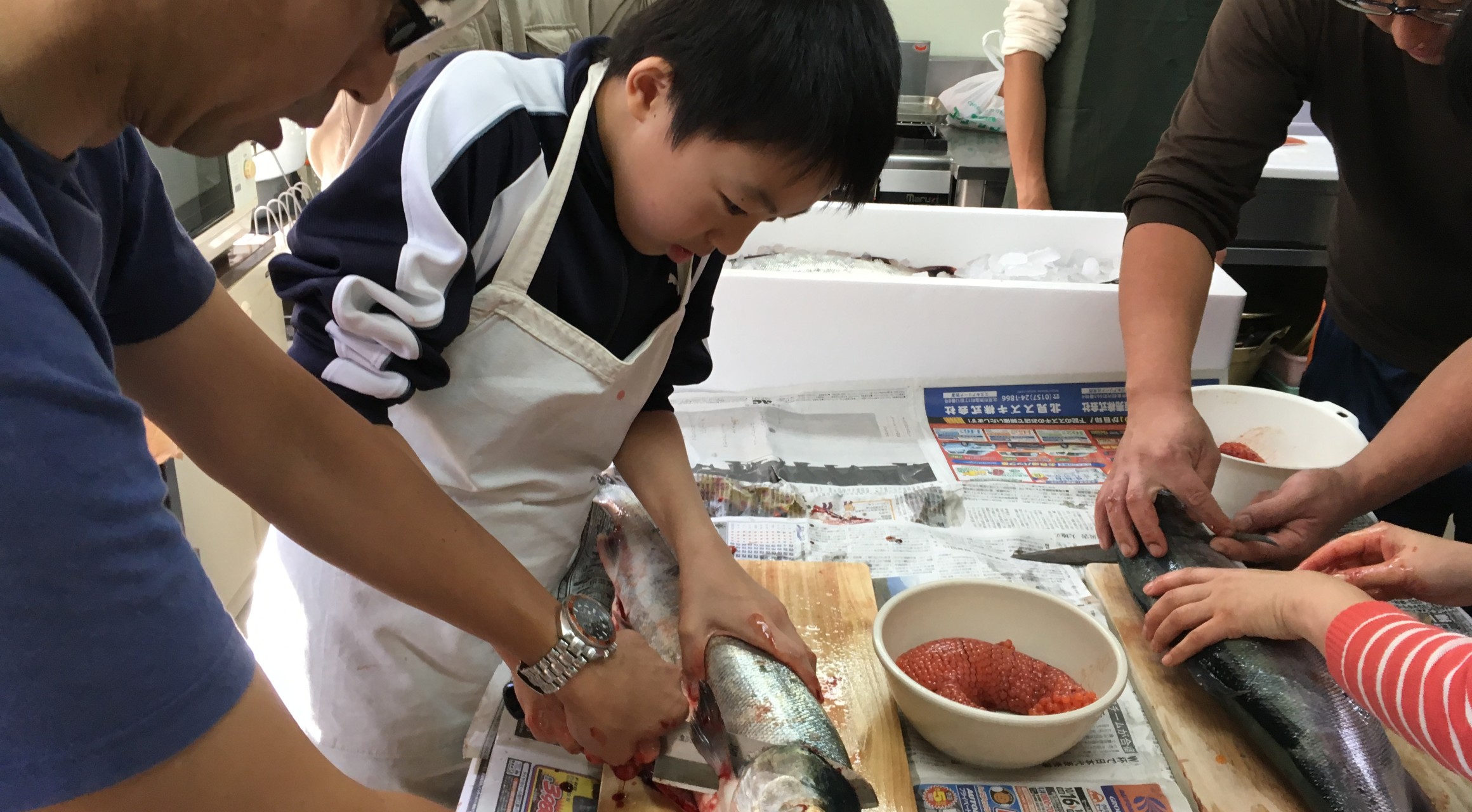 [メニュー]さけ水揚げ見学、網走川サケ捕獲施設見学、さけのさばき方、料理試食