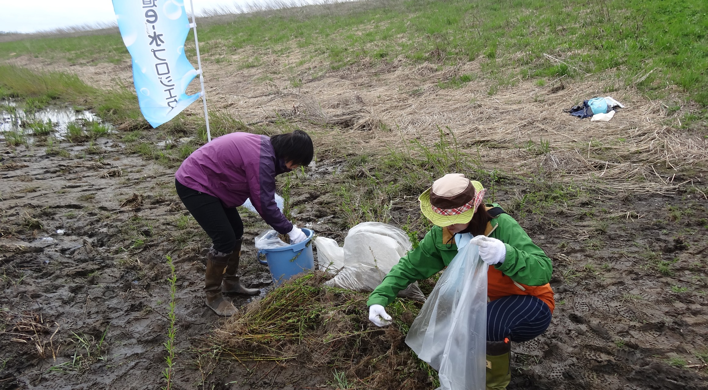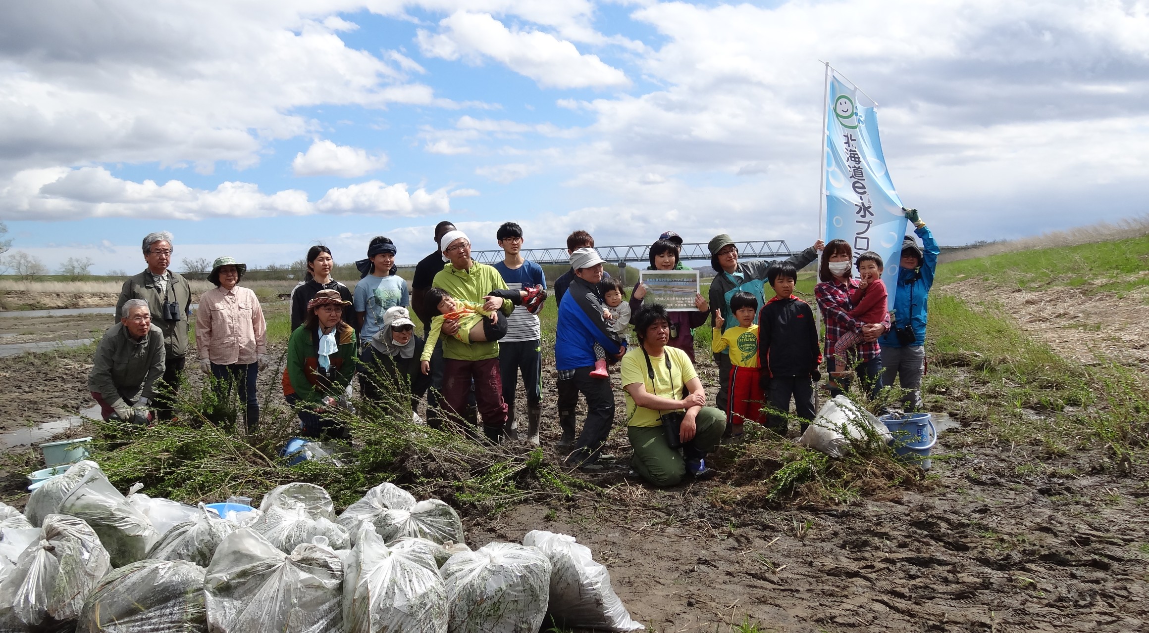 河川内にできた湿地を維持するために、生えてきたばかりの ヤナギの幼木を抜き取りながら河川清掃を行います。昨年はタカブシギをはじめシギ・チドリ類が集まり、タンチョウやカワセミも観察されました。湿地保全の可能性を探ります。
