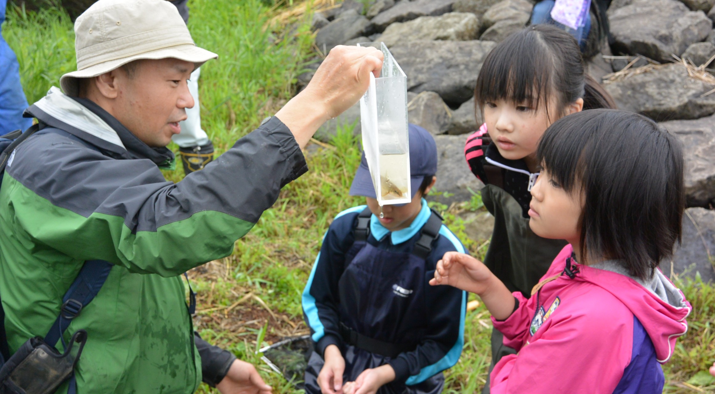 流域学習は流域住民の意識を川と流域の産業に向けることを目的として、網走川流域在住の小学生と保護者を対 象とし 7 月から 10 月まで計 4 回開催しました。第 1 回は 7 月 18 日に美幌町に位置する網走川支流駒生川にて「魚取り・生物観察」を実施しました。講師に 美幌博物館の町田学芸員を招き、アメマス、ヤマメ、フクドジョウなどたくさんの生き物を採取し観察しました。