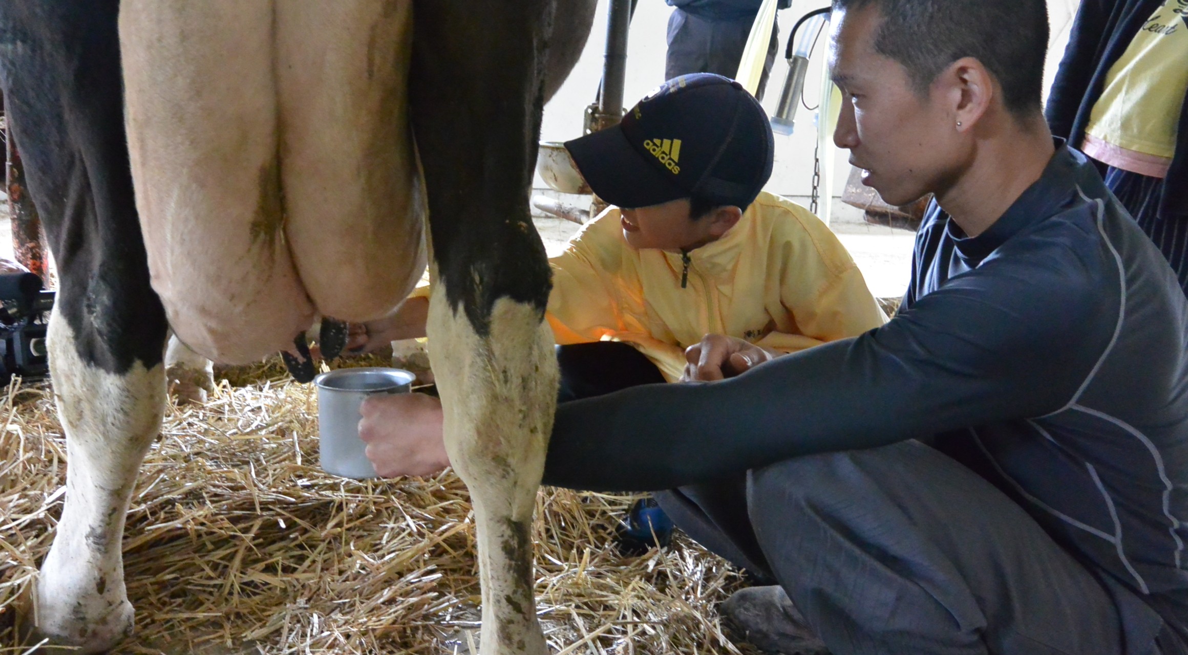 第 2 回は 9 月 11 日に津別町と大空町で農業・酪農体験学習を行い、津別町では日本で初めて JAS 有機を取 得した津別町有機酪農研究会の柏葉さんを講師に乳搾りや子牛への授乳、バターづくりを行いました。大空町では 株式会社大地の MEGUMI の赤石さんを講師に有機農業に関する説明や農業機械見学、芋掘りをおこない、自分た ちの作ったバターでジャガイモをいただきました。