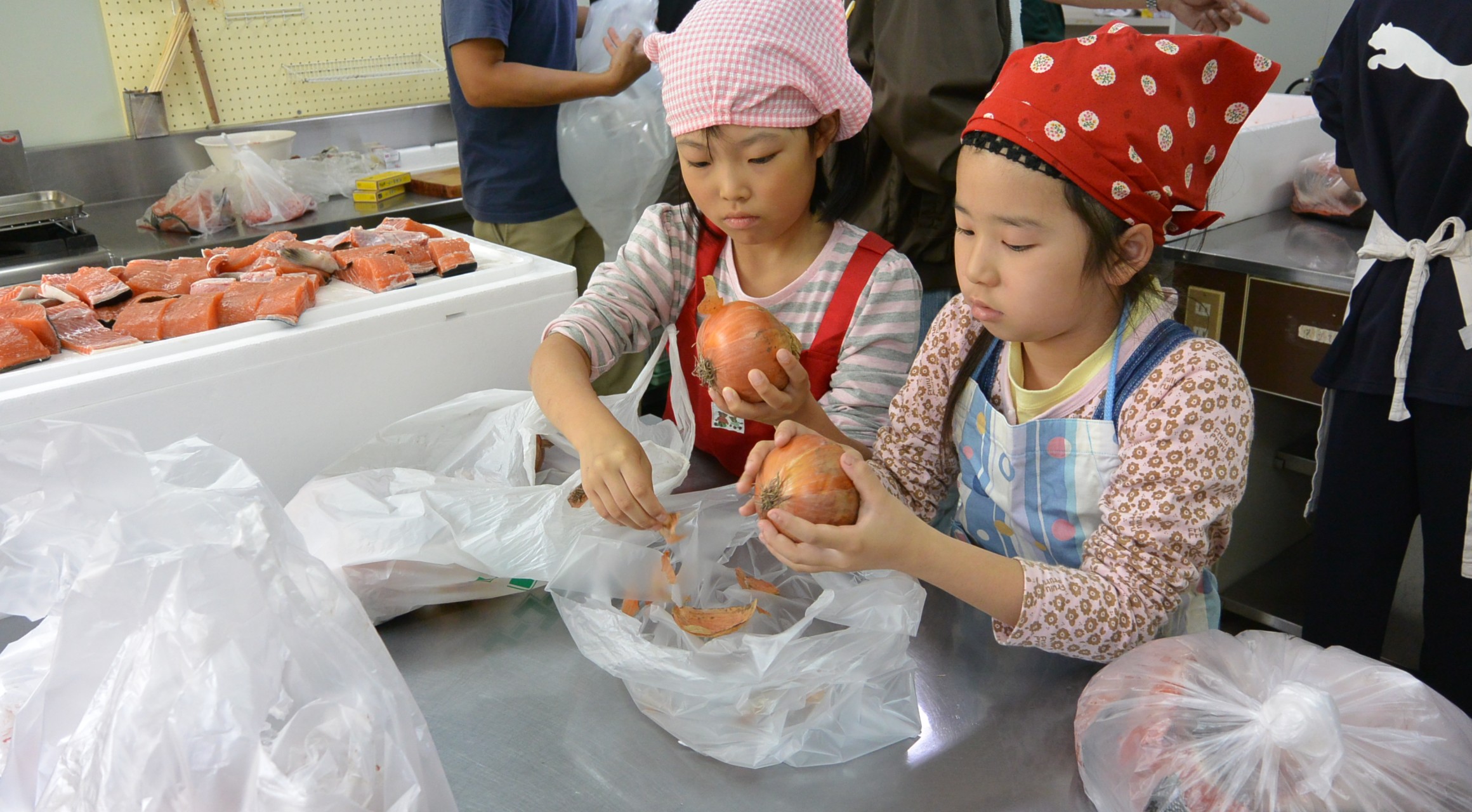 第 3 回は 10 月 1 日に網走で鮭の水揚げや親魚捕獲施設見学、サケのさばき方、調理・試食を行いました。鮭 の雄と雌の見分け方や、網走川で捕獲した鮭の採卵や受精を行いました。また網走漁協青年部長の品田さんを講師 に鮭を自分たちでさばき、津別町の有機タマネギと網走の鮭のホイル焼きを作っていただきました。