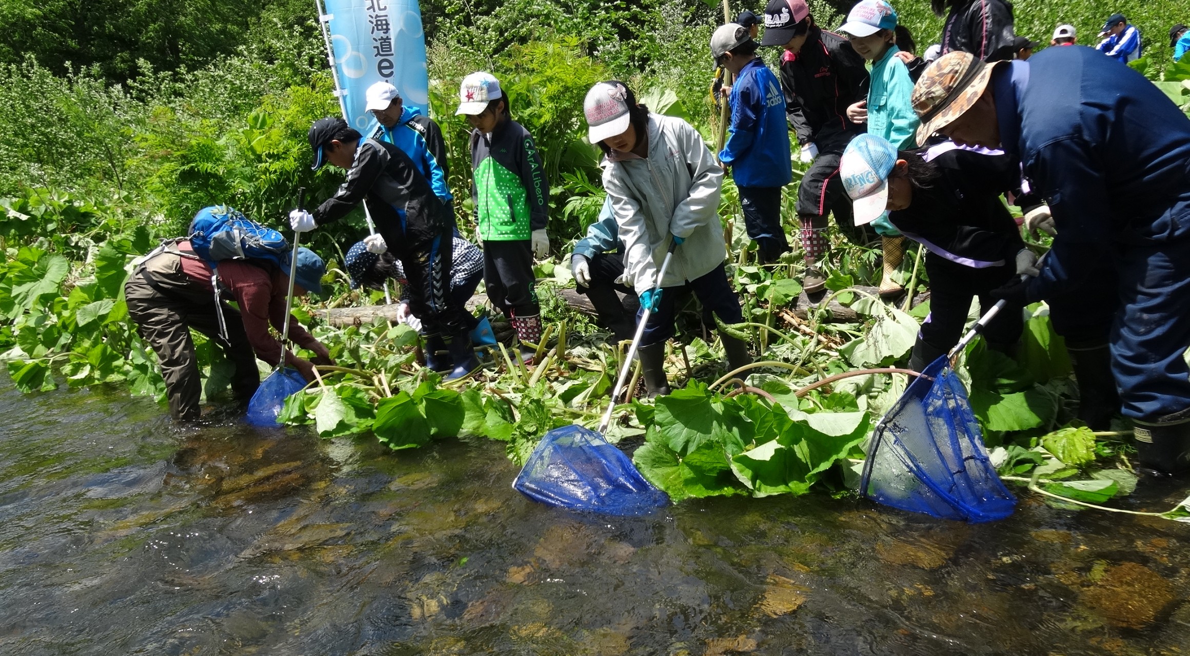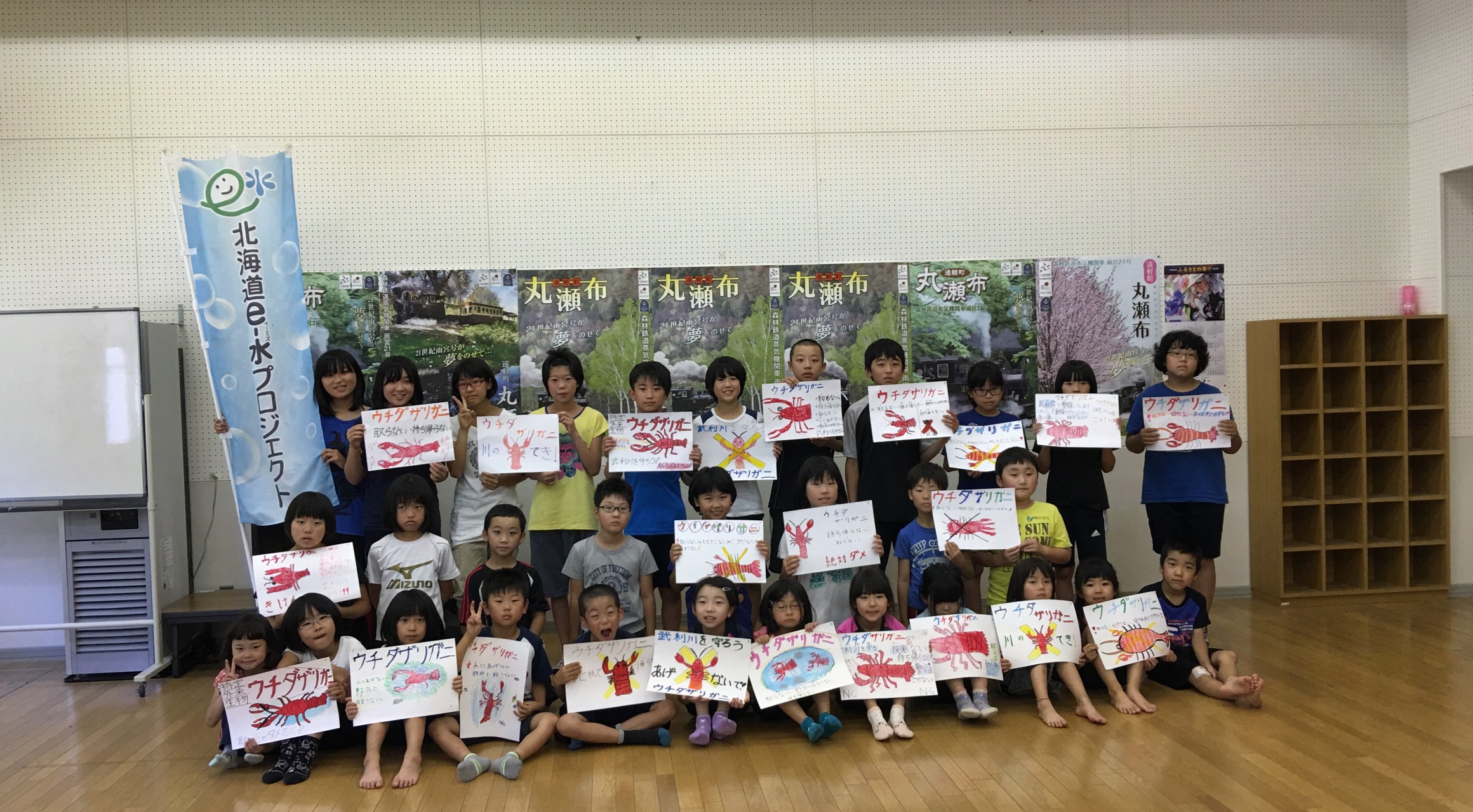 武利川上流部での水生生物を調べる活動でもウチダザリガニが見つかりました。丸瀬布昆虫生態館 の学芸員からウチダザリガニの特徴を学び、人の手によって繁殖区域が広がっていること、在来種の ニホンザリガニがいなくなっていることがわかりました。子どもたちは、身の回りの自然が壊されて きていることを知り、行動するきっかけとなりました。