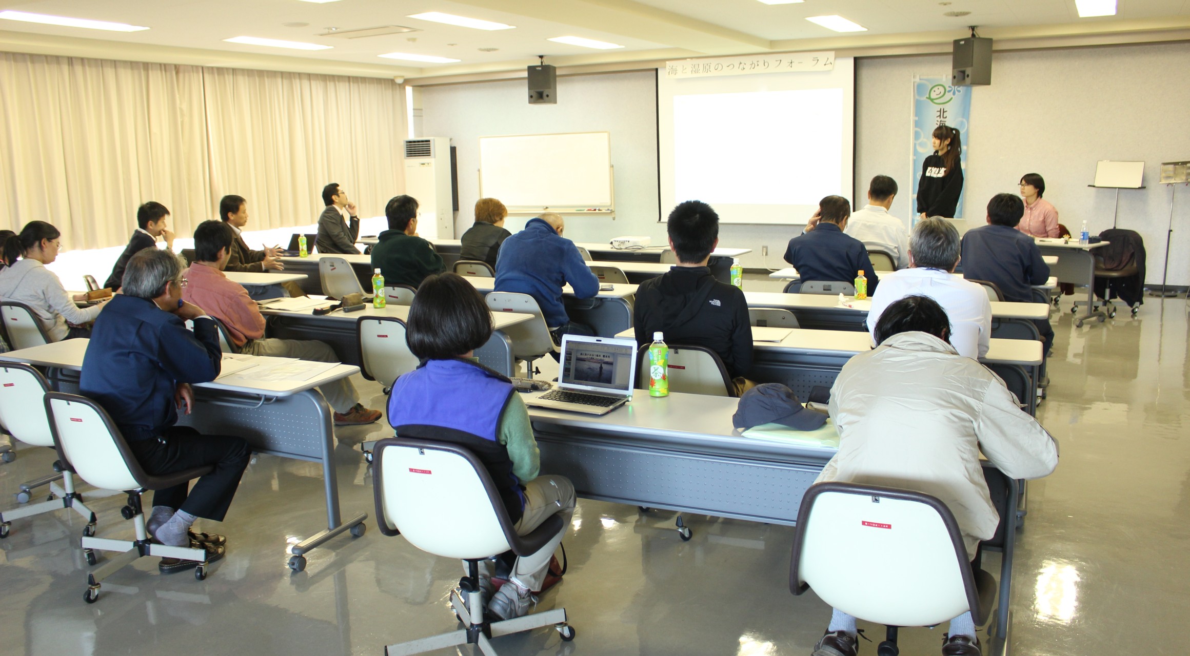 10 月 11 日には、これまでの調査内容を町民にお知らせし、今後の展望について議論する場として、 「海と湿原のつながりフォーラム」を開催しました。野外調査にご協力いただいた北海道立総合研究機 構林業試験場の長坂晶子氏と、北海道大学地球環境科学院の巴シン氏にこれまでの調査内容についてご 報告いただいたほか、総合地球環境科学研究所の石川智士氏、国立研究開発法人水産研究教育機構瀬戸 内海区水産研究所の堀正和氏にご講演をいただきました。フォーラムでは、地域住民の自然保護への意 識付けには、自然体験だけではなく「なぜ」「どのように」守るかを明確にする必要性や、自然環境の「つ ながり」だけでなく、産業間の「つながり」を意識し、様々なステークホルダーが同じテーブルについ て流域保全に取り組むことの重要性が指摘されました。