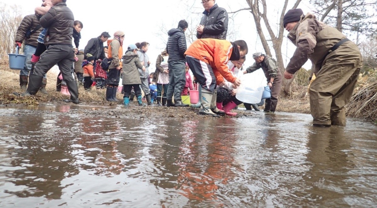 2. サケ・マス自然復帰事業 4月2日に雨煙別川支流高橋の沢川からサケの稚魚放流を行い、6月16日にはサクラマスの幼魚の放流を実 施した。また、9月・10月・11月には夕張川と雨煙別川等支流の産卵床調査を行い、夕張川本流にシロザケ 33床、サクラマス7床を確認し、雨煙別川等支流にシロザケ5床、サクラマス57床を確認した。特に雨煙別 川では、「73年ぶり」に、実際に産卵しているサケ・マスの姿を見ることができた。