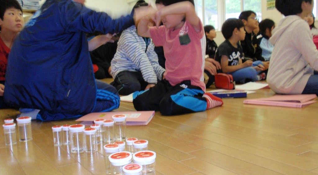 武利川上流で水生昆虫の採取を行いました。昨年の大雨の影響もあり川の形も変わっていましたが、子供たちは元気に捕獲用の網を持ち29名で63匹の水生昆虫を捕獲しました。捕獲後標本作りに向け取りあえずアルコール漬けにして8・9月の作成に向け保存します。