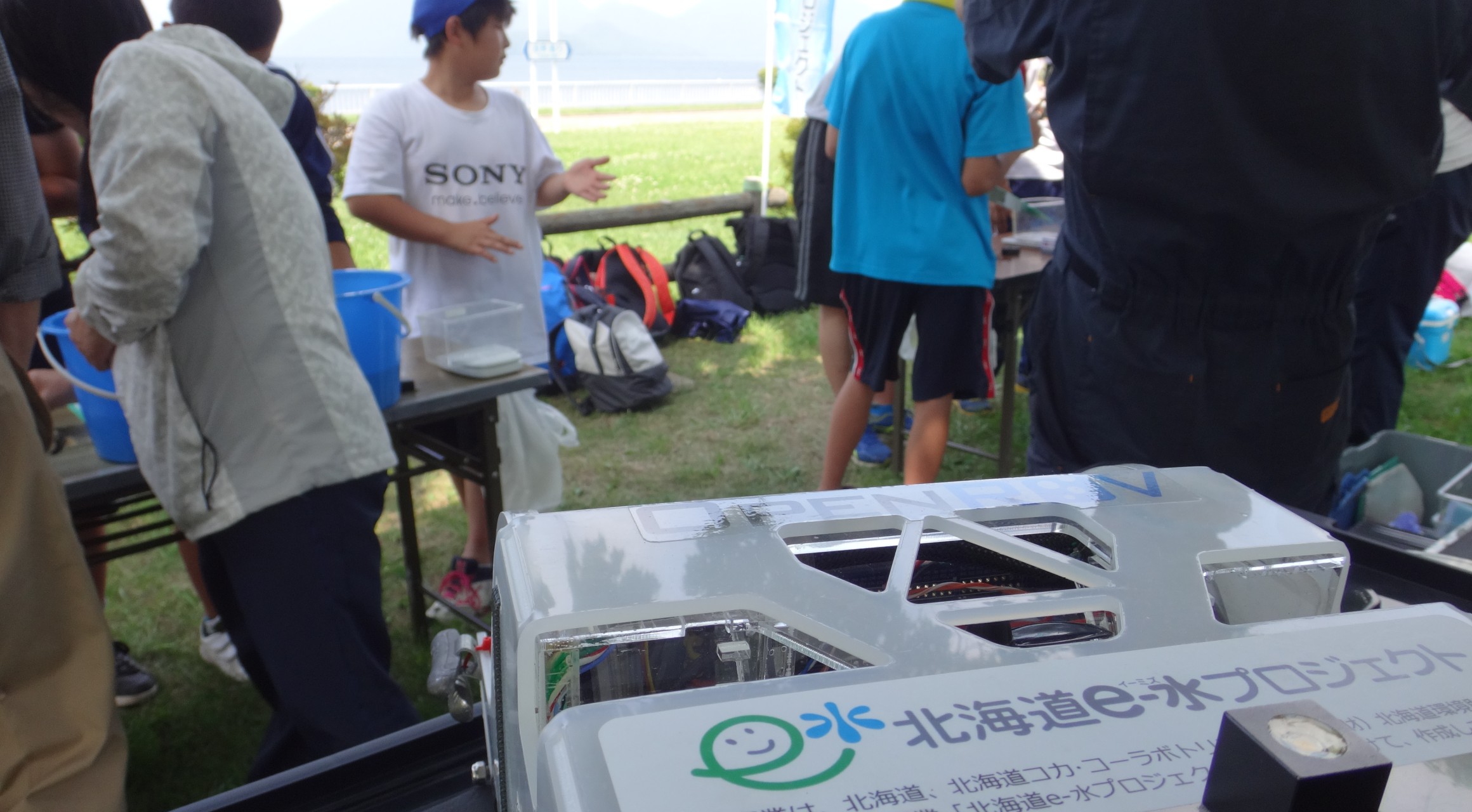 平成 29 年 7 月 14 日・8 月 31 日には地元の洞爺湖町の虻田小学校と洞爺中学校の総合学習でウチダ ザリガニの環境学習と水中ドローンを使った湖底観察会を行いました。子供達からは洞爺湖の水は綺麗で 透き通っている、魚が見えた!ウチダザリガニ見えた!などモニターに映る映像を興味深く見ていました。