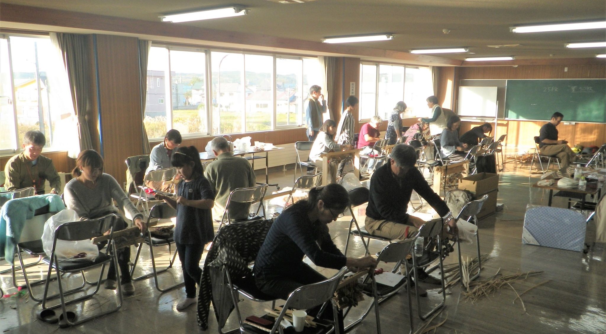 10月21日当日は14名の方が参加しました。午前中はガマを採集した当別自然再生地の観察。午後は、アイヌ文化活動アドバイザーである貝澤美和子氏、貝澤珠美氏の指導のもと第一弾のときより小さいゴザをつくりました。