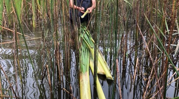 湿地の魅力は希少な動植物の生息場所であることだけではなく、そこには湿地とともに暮らした人たちの文化がありました。湿地に関わる豊かな文化に触れるために、湿地に生えるガマを活用して作ったゴザづくり(チタラペづくり)を行いました。事前の準備として、9月29日に当別自然再生地にてガマの採集を行いました。平日にも関わらず、6名の方が参加しました。