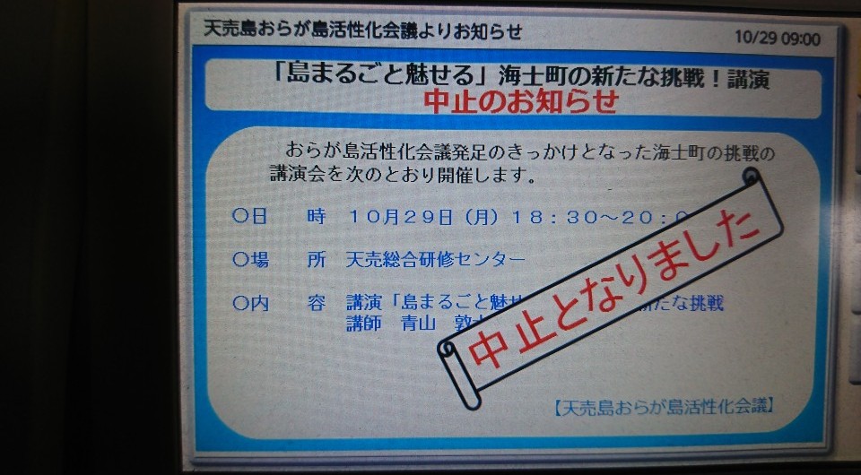 最後に10月29日に地域活性化の全国的なモデルでも知られる島根県隠岐諸島にある海士町から青山敦士氏をお招きし海士町での取り組みを中心に講演会を予定しておりましたが、天候が大荒れになってしまいフェリーの欠航が確定的だったためやむなく中止と致しました。