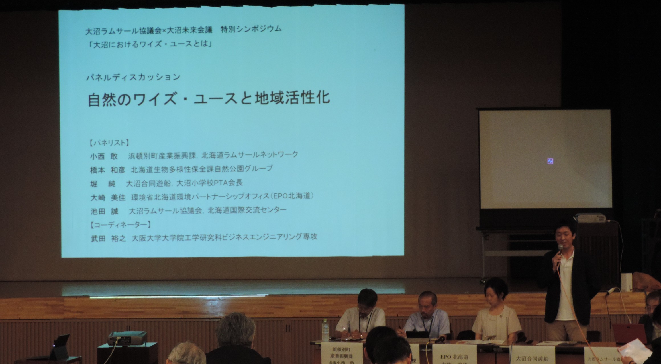 「地域の問題」では、大沼へのビジターセンター設立や自然を活かした地域づくりを考えるシンポジウムを7月19日に行いました。基調講演にクッチャロ湖の小西 敢氏をお呼びし、ラムサール条約地とビジターセンターの役割についてお話しいただきました。パネルディスカッションでは、大沼に関わりのある方や地元の方を交え自然と地域を考えるきっかけづくりを行いました。