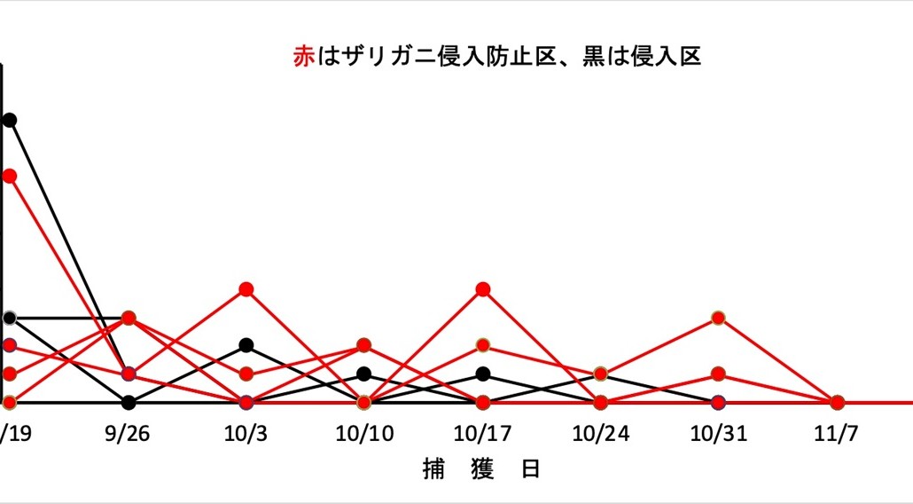 9月16日から11月14日までの毎週の結果では、ザリガニの侵入を防いだ方形区と、自由に侵入できた方形区の間で捕獲される個体数に差はなく、どちらの区でも捕獲個体数の減少が見られ11月7日にはどちらの区でもザリガニが捕獲できなくなりました。