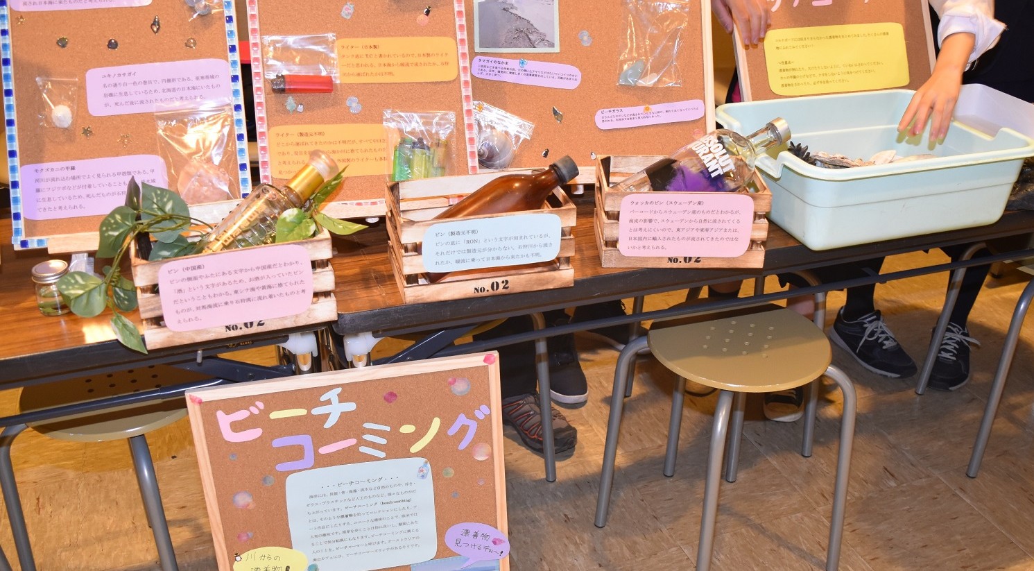 ・藤女子中学校・高等学校科学部は、採集物を大きな布に複数のポケットがあり、そこに漂着物がジプロックに入った状態で収納されて展示で、推理クイズを通して漂着物がどこから来たのかなどこの穴はどうしてできたのかなどの考えてもらうものです。