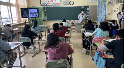 ・5月11日(火)松城小学校の5年生19名を対象に、 松前の観光資源の説明と、その中の自然を題材に 歴史と小松前川支流域の大切さを授業