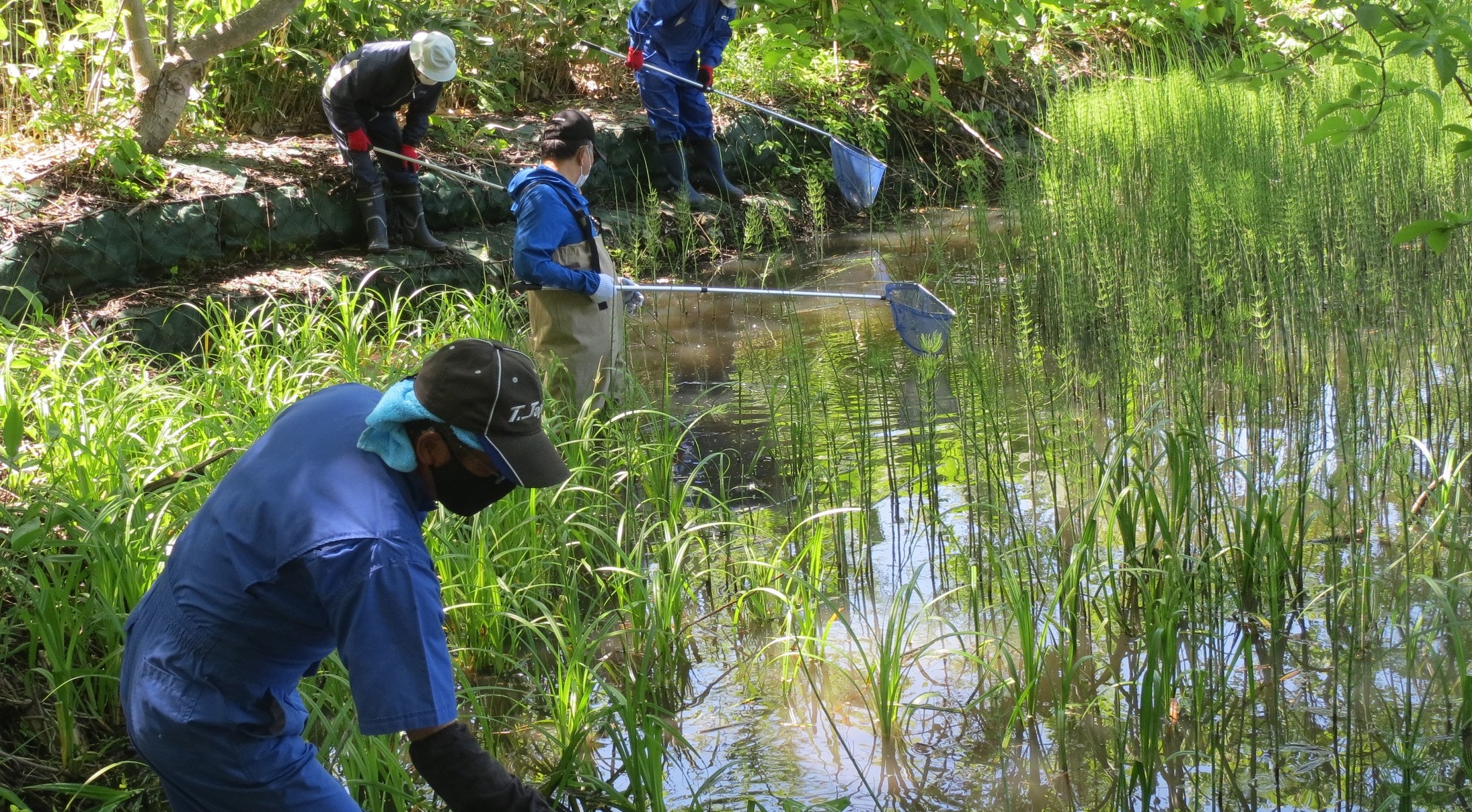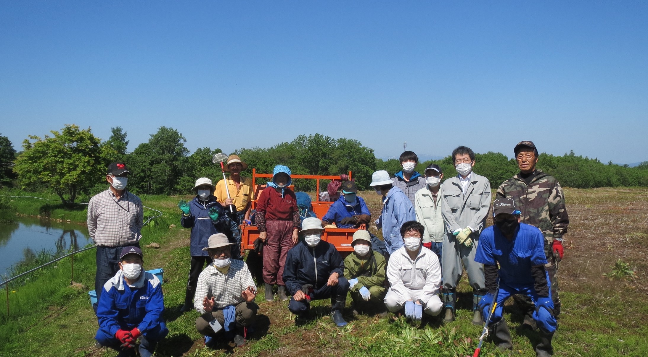 池の周囲に設置したフェンスの撤収作業を皆で行いました。6月5日は朝8時から総勢18人が参加して4つの池のフェンスを一気に撤収しました。余った時間は、オタマジャクシ捜しもやりました。