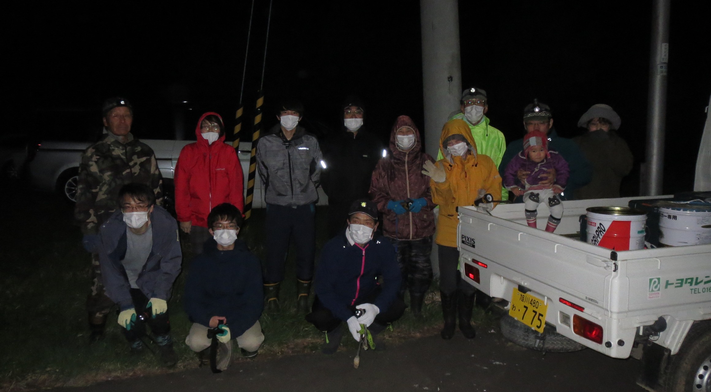 ヒキガエル駆除活動のメインイベント、繁殖期における毎晩の巡回捕獲作業を延べ451人の参加で行いました。その奮闘ぶりは5月26日の北海道新聞 (中北空知版)にも大きく掲載されました。