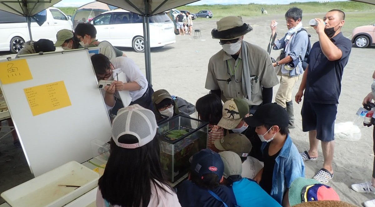 8月1日には関係者向けのビーチコーミング実習と、地域住民を対象に自然観察会を実施しました。自然観察会では、生きもの展示解説ブース、ガイドウ ォークと調査体験を行い、親子連れ中心に34名が参加しました。