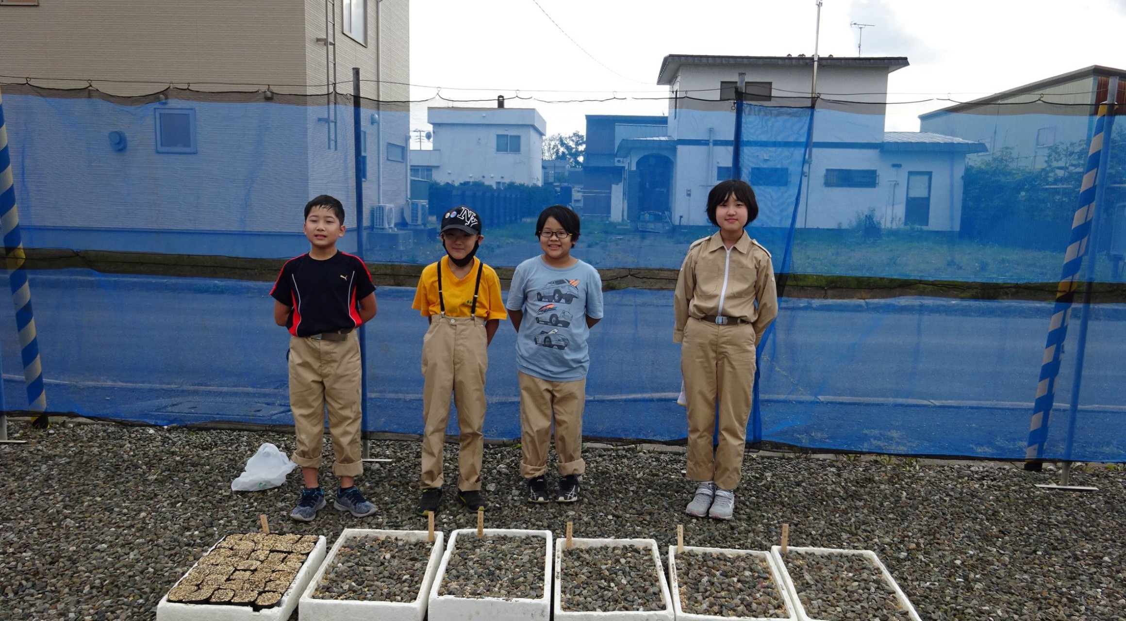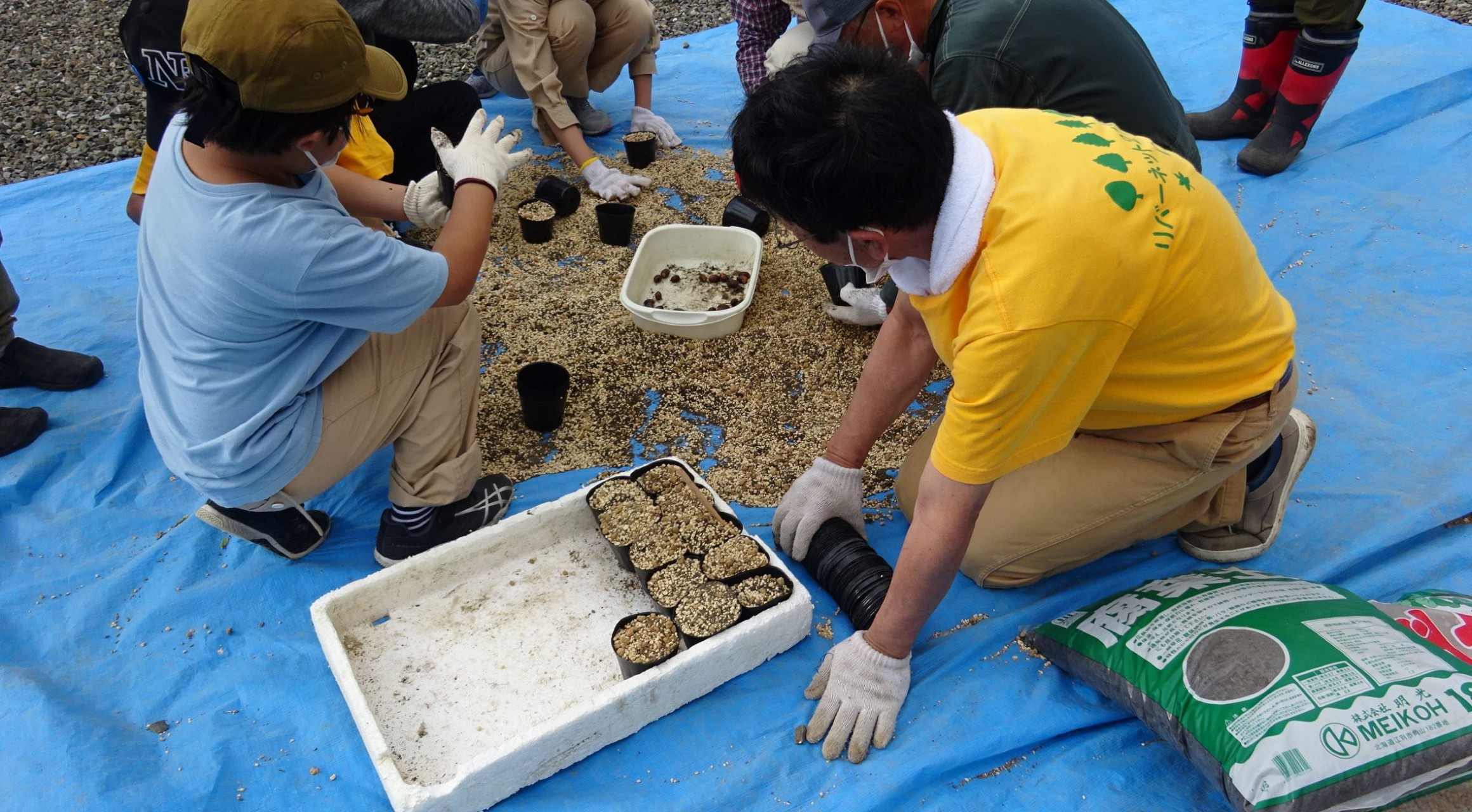 まず、千歳川河川敷地内で、直径3メートルのユニットに、本団が種から育成したハルニレ・ミズナラ等種類の違う苗木10本を植え、合計150本の植樹を行いました。その後、近くの山の木から種を採取し、本団所有の苗場ヤードで発泡スチロール箱に苗床を作成し種蒔きを行ない、水撒き等の育苗管理を行って、今後の植樹用の苗木の育苗を行いました。