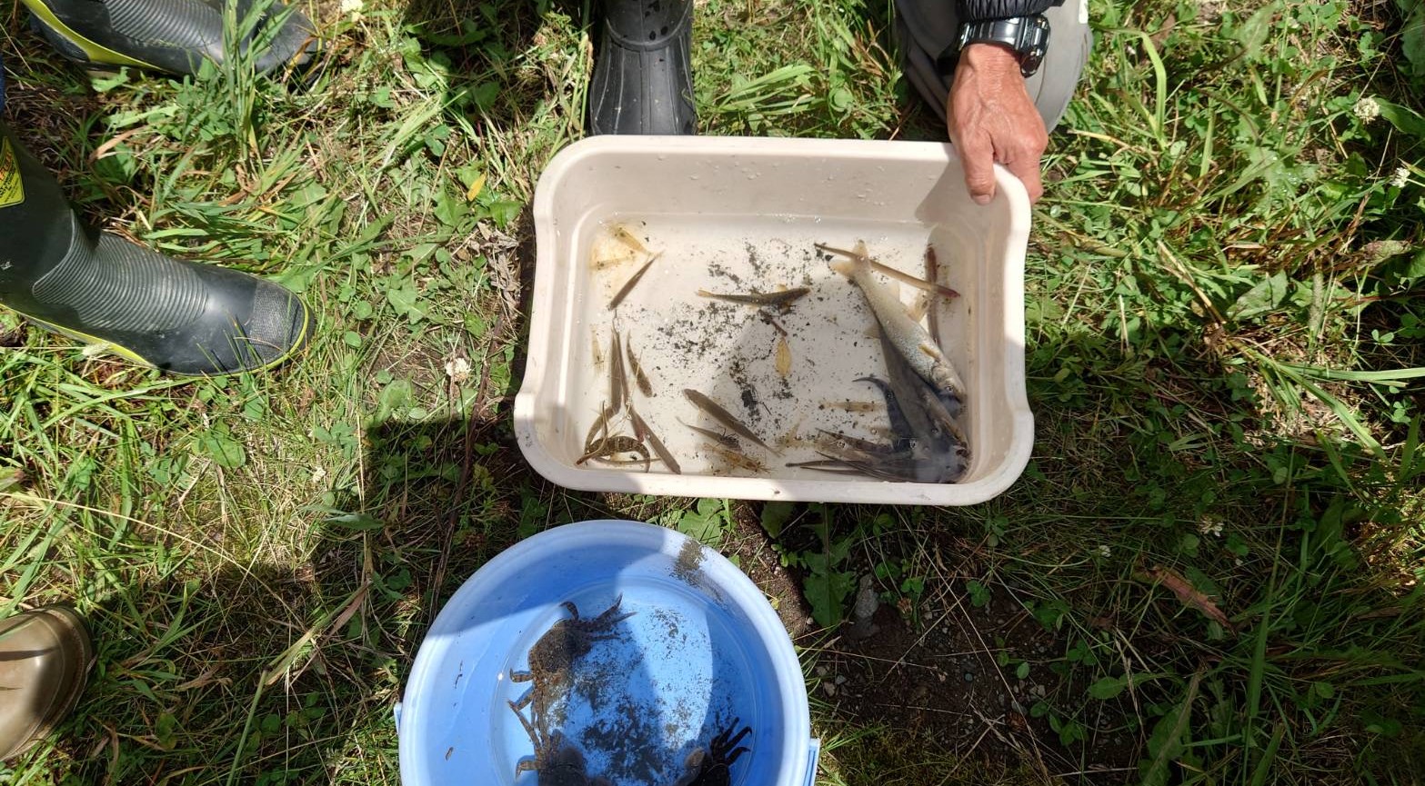 この年の沙流川の流況は一年を通して渇水と言ってよいほど水量が少なく、調査当日も炎天下かつ河川流水も生暖かく、ヤマメなど清水を好む魚が酸欠状況 になっている場所もありました。渇水・高温に不安を抱きながらも、妹尾所長の電気ショッカー調査により、15cm ほどに成長したニホンウナギ(通称黄ウナギ)が 2 尾確認することができました。