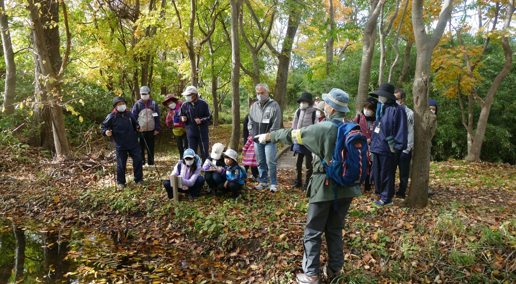 観察会では、多様な自然が残り、四季折々に楽しめる水車アヤメ川自然公園を直に知ってもらうため、春は山野草鑑賞(参加 39 名)、夏はいきもの採取(参加 36 名)、秋は紅葉鑑賞と公園の歴史説明(参加 52 名)を行いまし た。