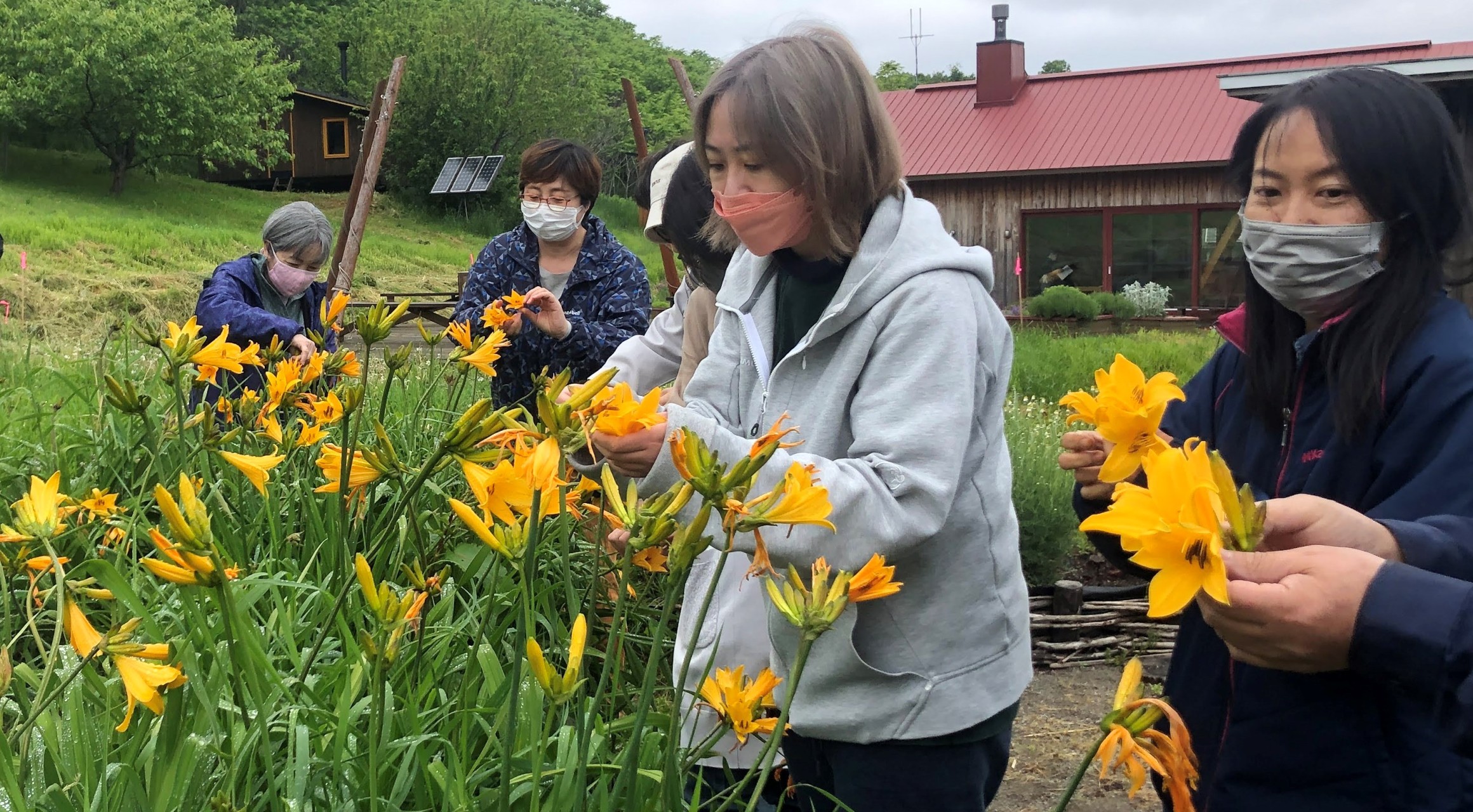 北海道の湿地の食材として有望なエゾカンゾウの増殖とレシピ開発では、エゾカンゾウの育成・栽培を余市の畑で進め、「エゾカンゾウの収穫と料理ワー クショップ」を薬膳師でフードコーディネーターの荒井直子さんを招いて、6月4日に開催しました。参加した12名で畑に咲き乱れるエゾカンゾウの花と蕾を摘み取って、講師の案内で次々と料理をしていき、7 つの素敵で美しいエゾカンゾウ料理が出来上がりました。中国から伝わる生薬『金針菜』の仲間のエゾカンゾウ、この季節に気をつけたいことやエゾカンゾウの効能などを薬膳の観点から優しくお話しいただいて、自分の健康のことなども考えながら皆で美味しくいただきました。