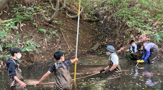 その 2「ふしぎ池大解剖計画」今年9月、都市環境林にある「ふしぎ池」とよんでいる池の測量と池底調査を行いました。この池は2016年から毎年「エゾアカカエル」 「エゾ サンショウウオ」の卵塊を観察している湧水のある池です。池底には落ち葉が堆積し、酸素不足になっています。また山から雪解けとともに土砂が 流入していることが分かりました。生き物が繁殖地として使い続けること ができるよう池底の環境改善が必要だということがわかりました。