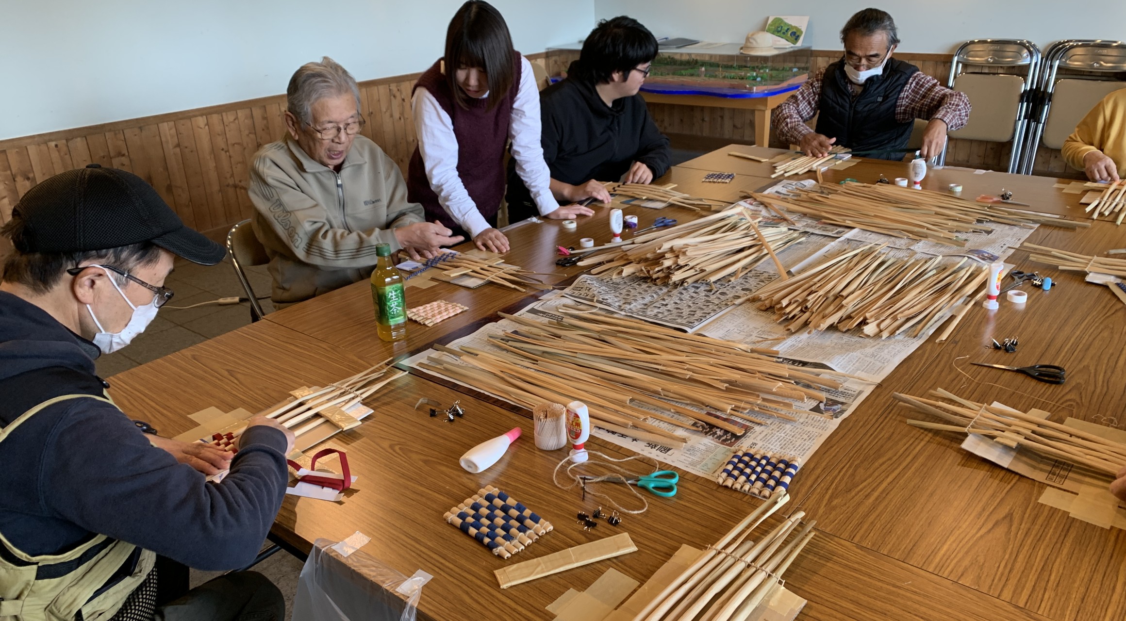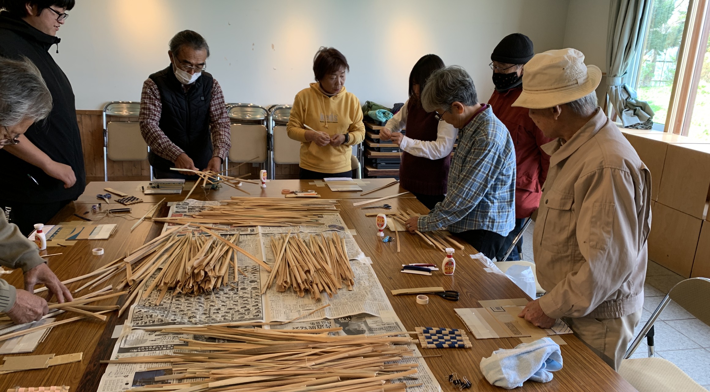 その後、海鳥センターに会場を移し、シキナ(ガマ)の葉でコースター作りを行いました。最初、同会の越宗さんから水鳥池が浚渫前にどのような様子だったのか、羽幌高校ラグビー部の強者に手伝ってもらい刈り取ったガマの葉を洗って乾燥させて使っていることなどの説明ののち、越宗さん指導のもと7名の参加者がコースター作りに取り組みました。葉や装飾に使う紐の選び方により作る人の個性あふれる作品が生まれました。 少しでも、ビオトープ公園に関心を持つ町民が増えるとよいですね。