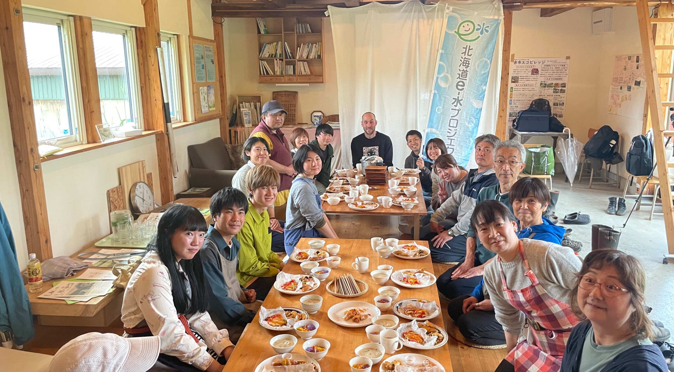 北海道の湿地の食材として有望な「湿地の恵み料理体験とレシピ開発」では、畑で増殖中のエゾカンゾウの花と、新たに沼で採れるヒシの実を材料に、採取と料理ワークショップを行いました。エゾカンゾウは6月に薬膳師でフードコーディネーターの荒井直子さんを招いて、増殖畑のある余市エコビレッジで開催しました。参加した10名で畑に咲き乱れるエゾカンゾウの花と蕾を摘み取って、講師の案内で次々と皆で料理をしていき、素敵で美しいエゾカンゾウ料理5つが出来上がりました。中国から伝わる生薬『金針菜』の仲間のエゾカンゾウ、この季節に気をつけたいことやエゾカンゾウの効能などを薬膳の観点から優しくお話しいただいて、自分の健康のことなども考えながら皆で美味しくいただきました。ヒシの実は当別町の沼で9月に採取し、10月に料理ワークショッ プを、アイヌ文化を伝承している川上裕子さんを招いて札幌市内で開催しました。16名の参加者の皆さんとヒシの 実の殻を剥き、手分けして料理を作っていきました。美味 しくいただいた後、アイヌ文化についてもお話しいただいて、皆で踊ったり、楽しく学び、心も身体も満たされまし た。