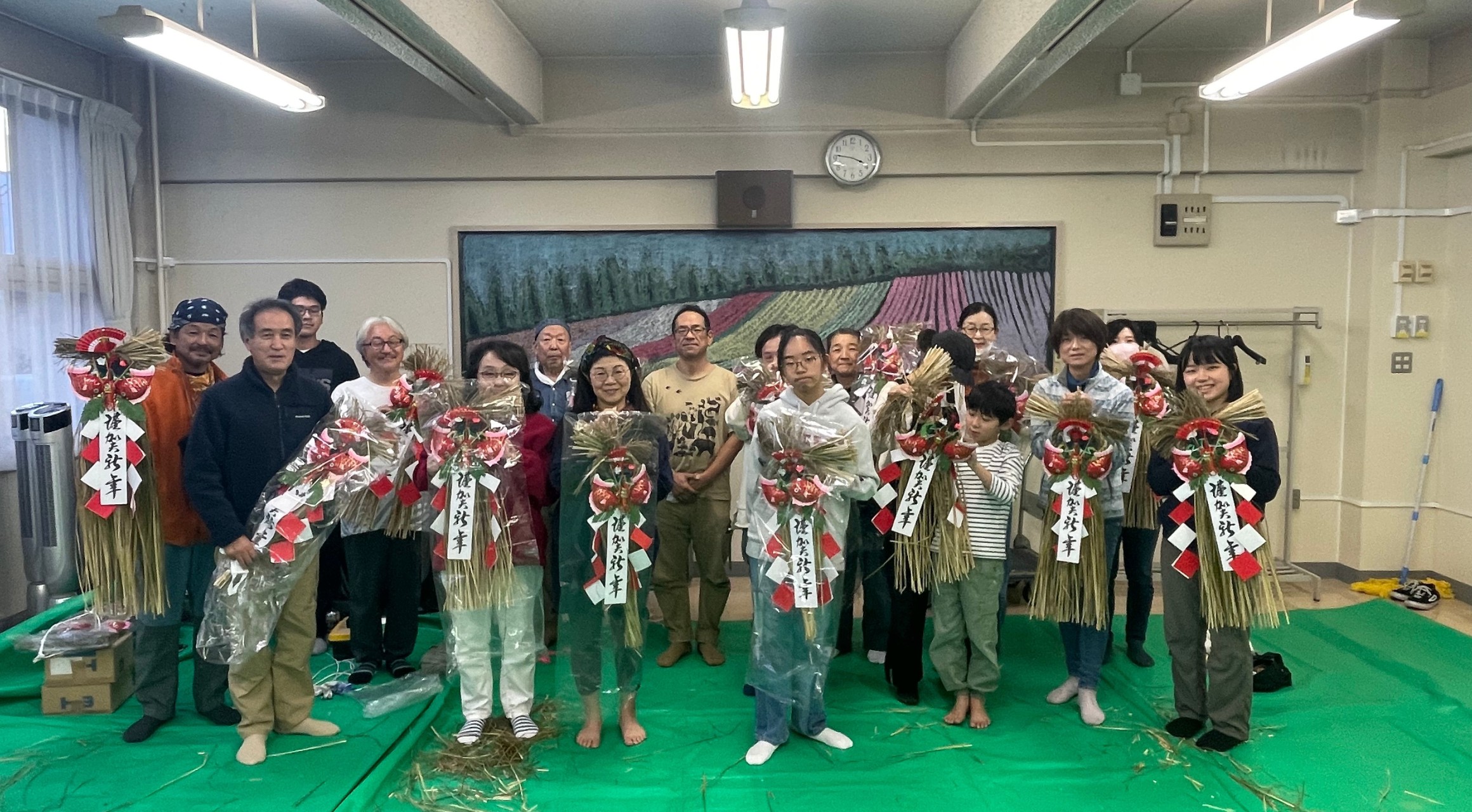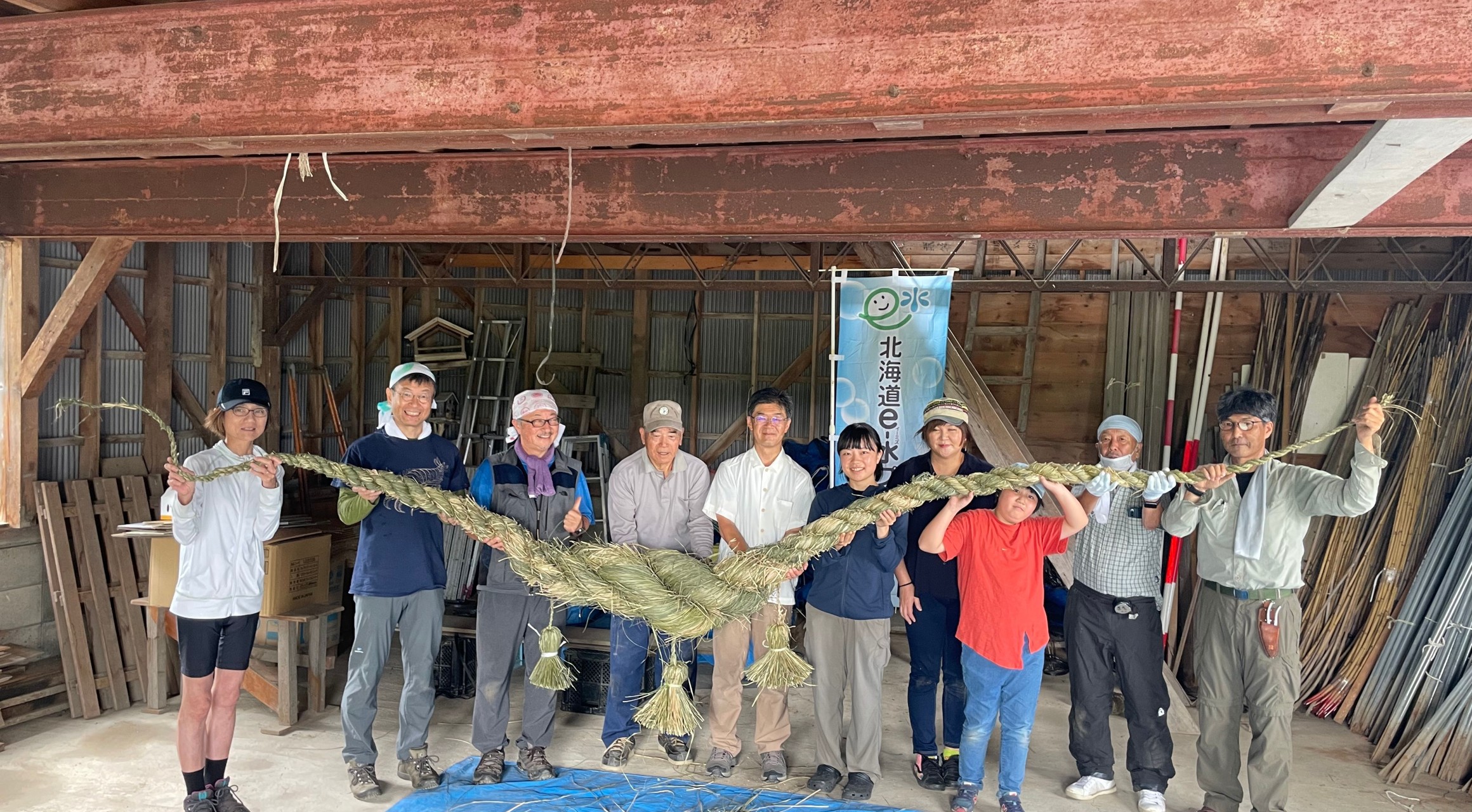 〆縄の材料でもある「 『カサスゲ』の調査・育成と利活用ワークショップ」では、近年湿地の減少に伴って身近な湿地の植物であったカサスゲ群落が消失したことと、地域の高齢化やコロナ禍により地域の〆縄づくりが途絶えつつあることから、カサスゲ群落を保全・保育するとともに、スゲ田によるカサスゲの確保と文化継承を目指しています。カサスゲの残存場所を専門家の濱田崇さんと早春から探索して群落を更にいくつか確認しました。昨年の試行結果から群落周囲のヨシなど高茎植物を除去することでスゲの生育が促進され、刈取りし易くもなることから、5月と 6月に雑草除去作業を皆で行いました。刈取りは、月形町の里山と江別市の石狩川河畔林で7月に11名が参加して行い、探索と保育作業の甲斐あって、昨年の数倍のスゲを収穫できました。水洗いをして夾雑物を除去して揃え、倉庫と納屋で乾燥させました。江別市八幡で20年程前まで神社の〆縄をスゲを刈って綯って奉納されていた武田さんという方に出会い、お願いして9月に11名で大きな〆縄つくりを指導してもらって作れました。宮島沼近くの大富神社に、来春奉納させていただきます。残りのスゲを使っ て、11月に家庭で飾る〆縄づくりのワークショップを12 名の参加で行い、講師の二杉寿志さんにスゲ〆縄の意味合いとともに作り方を教えてもらいながら〆縄をつくり ました。またスゲ田での増産の可能性を探るために採種して育苗箱に播種、今回は数百本が発芽しました。昨年発芽 したスゲ苗は10 月に新十津川の田んぼの横に試験植栽しました。