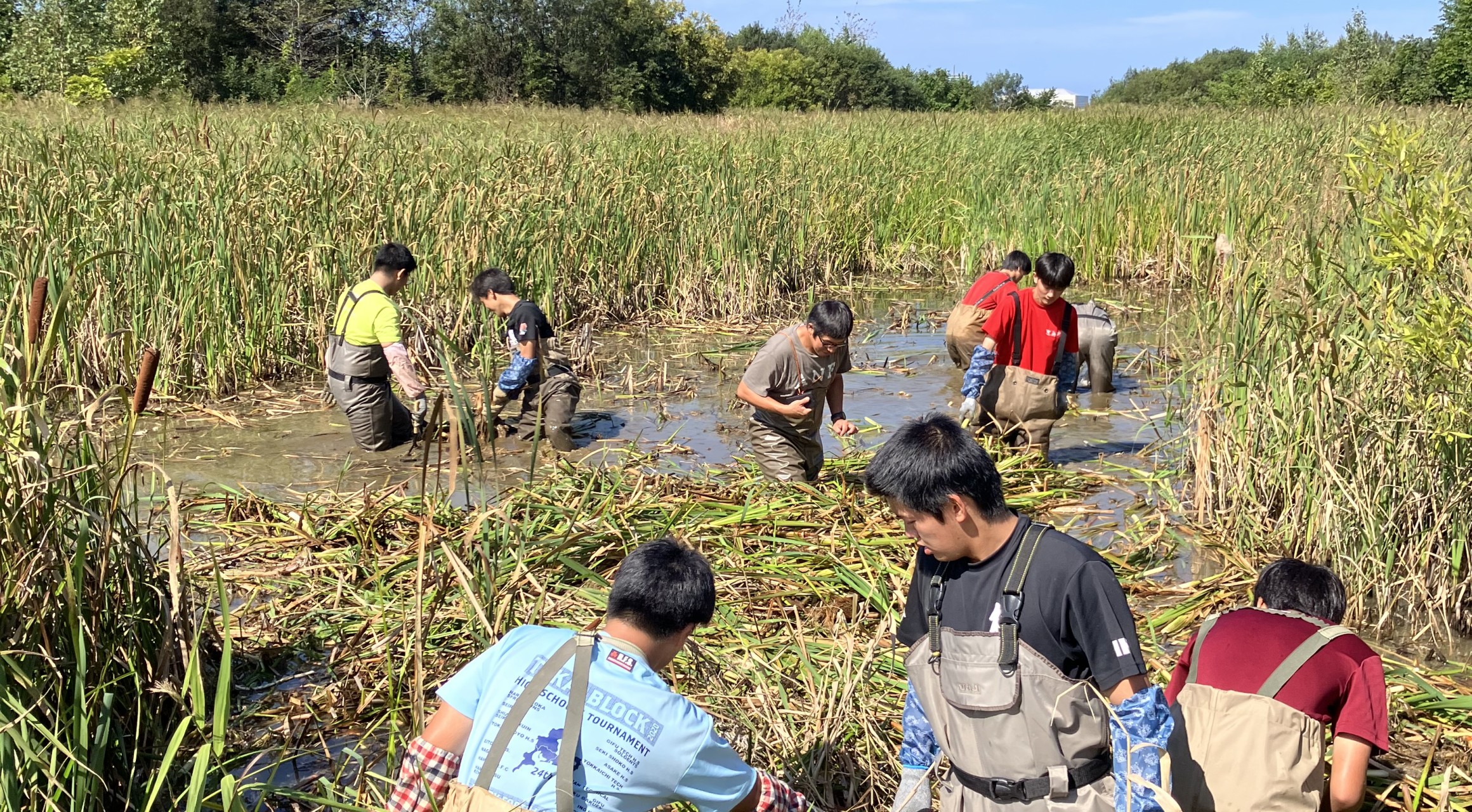 9月10日、羽幌高校ラグビー部の学生さんと一緒に水鳥池のガマの刈り取り作業を行いました。胴長を履いて池の中に入り、ガマの間引きを行いました。