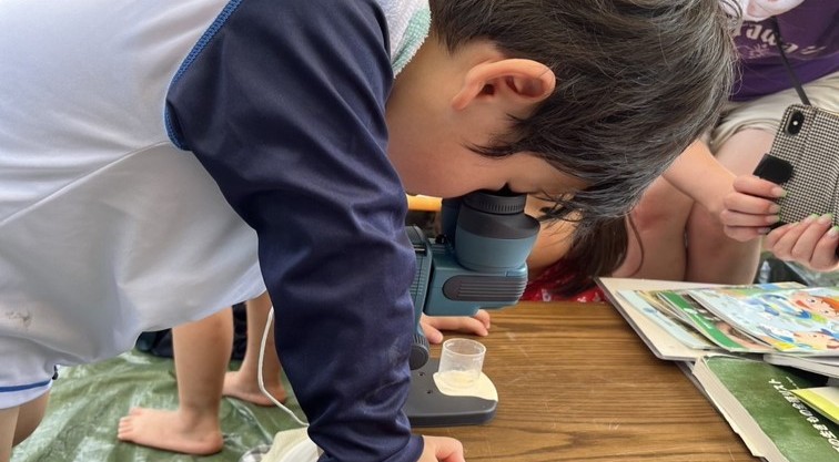 ・生き物のお話:田んぼでは毎回たくさんの生き物に出会い、危険な生き物の話や見つけた時の対処方法等も共有しました。初めての顕微鏡での観察は保護者も楽しんでいました。食う食われるの関係が少し解ったようでした。