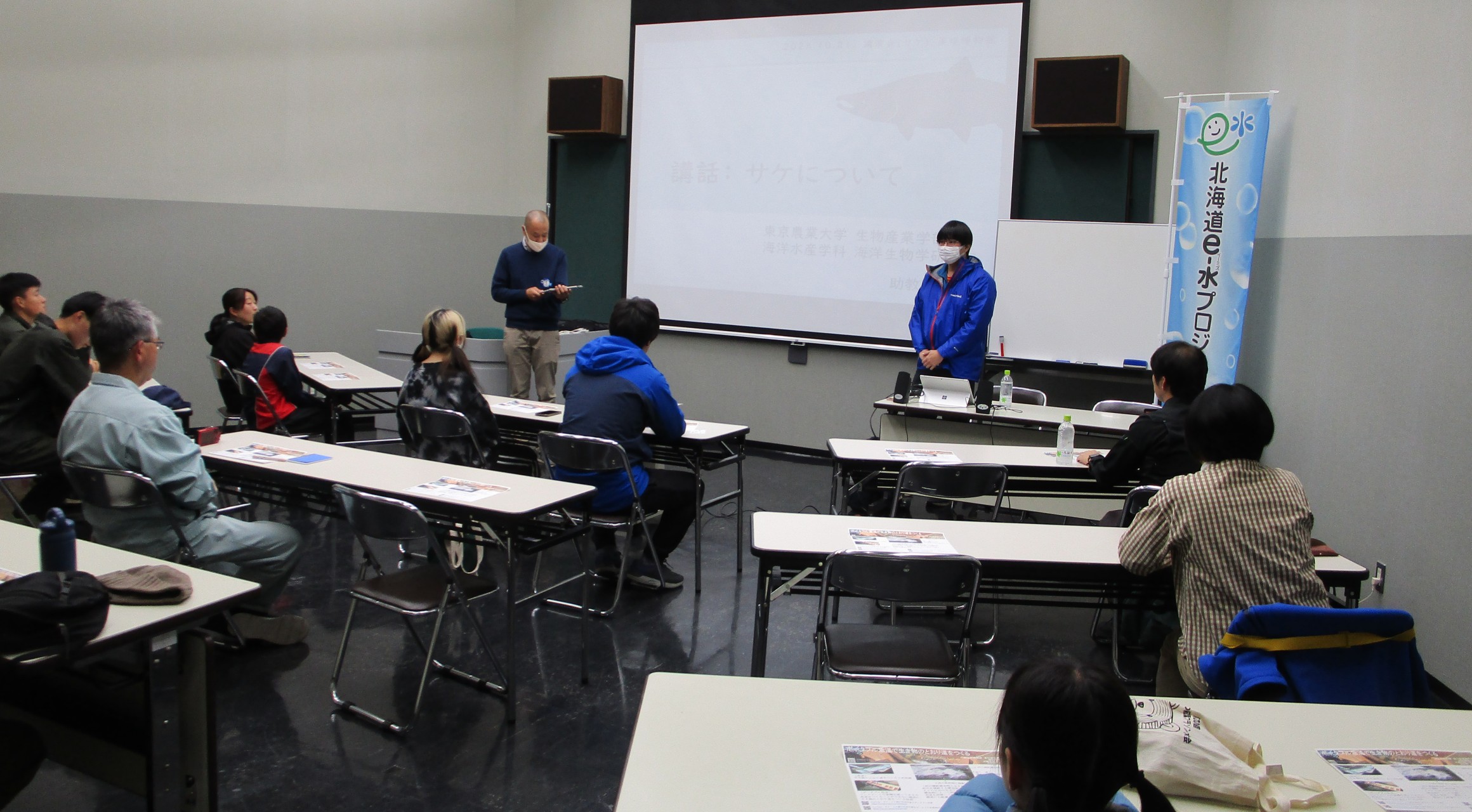 10月21日、いよいよポータブル魚道を使う日です。この日は、22人が集まりました。まず、ポータブル魚道を設置する前に、東京農業大学の福井翔先生からサケを遡上させることで得られる北海道の自然への効果をお話いただきました。次に、香川高等専門学校の高橋直己先生からポ ータブル魚道の解説を聞き、その後、実際に使うポータブル魚道の設置方法について、説明いただきました。事前説明のお陰で、現地では20分ほどでポータブル魚道が設置され、その後1時間ほどサケの遡上を観察しました。作業をした影響でサケが戻ってくるまで少し時間はかかりましたが、次々と遡上していくサケを参加者の皆さんとともに観察することができました。魚道の構造や設置位置を事前に検討していたので、昨年以上にたくさんのサケを遡上させることができました。多くのサケの遡上が落ち着いた11月16日にポータブル魚道を回収しました。綿製の土嚢袋と、魚道底面に浸けた布も一部破れていました。破れてはいましたが、ポータ ブル魚道の機能は損なわれることなく、運用することができました。今後は、布を2重にするなどの対応が必要だと感じました。