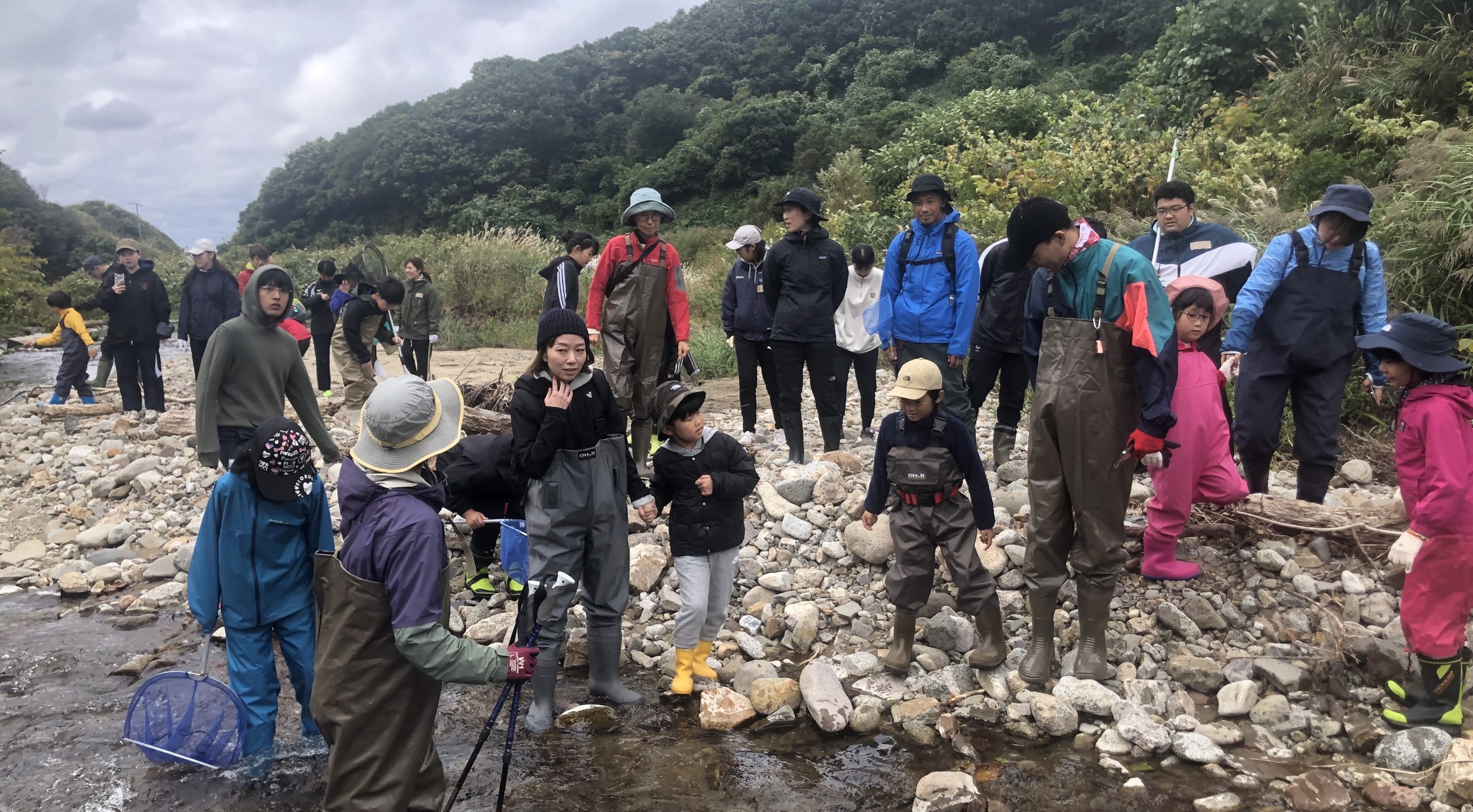 第3回:9月21日土曜~22日日曜 地元を離れて客観的に大沼での環境再生型観光を考える ために、遠征キャンプを実施しました。せたなの良瑠石川 (らるいしがわ)に鮭を戻す切れ目の入ったダムの見学と、 再生した川に戻ってきた生き物の観察を行いました。川を 遡って切れ目の入ったダムを実際に見学しながら自然再生 のお話を聞き、10年でせたな町にシャケが戻ってきたとい う事実を学びました。川を遡りながら、カジカやウキゴリの 違い(吸盤)を観察したり、熊の足跡を探したり、サルナシ の実を食べたりと楽しいフィールドワークとなりました。大沼に戻り、環境再生をエコツアーコン テンツに取り込む為に必要な要素を話し合いました。良瑠石川での体験は、川の生き物を捕まえる 等楽しい要素はあったものの、環境再生自体に参加者が関与したという達成感や自己有用感には繋 っていなかった為、大沼でのツアーには直接作業を伴った達成感を味わえるコンテンツを盛り込む 必要性を再確認しました。