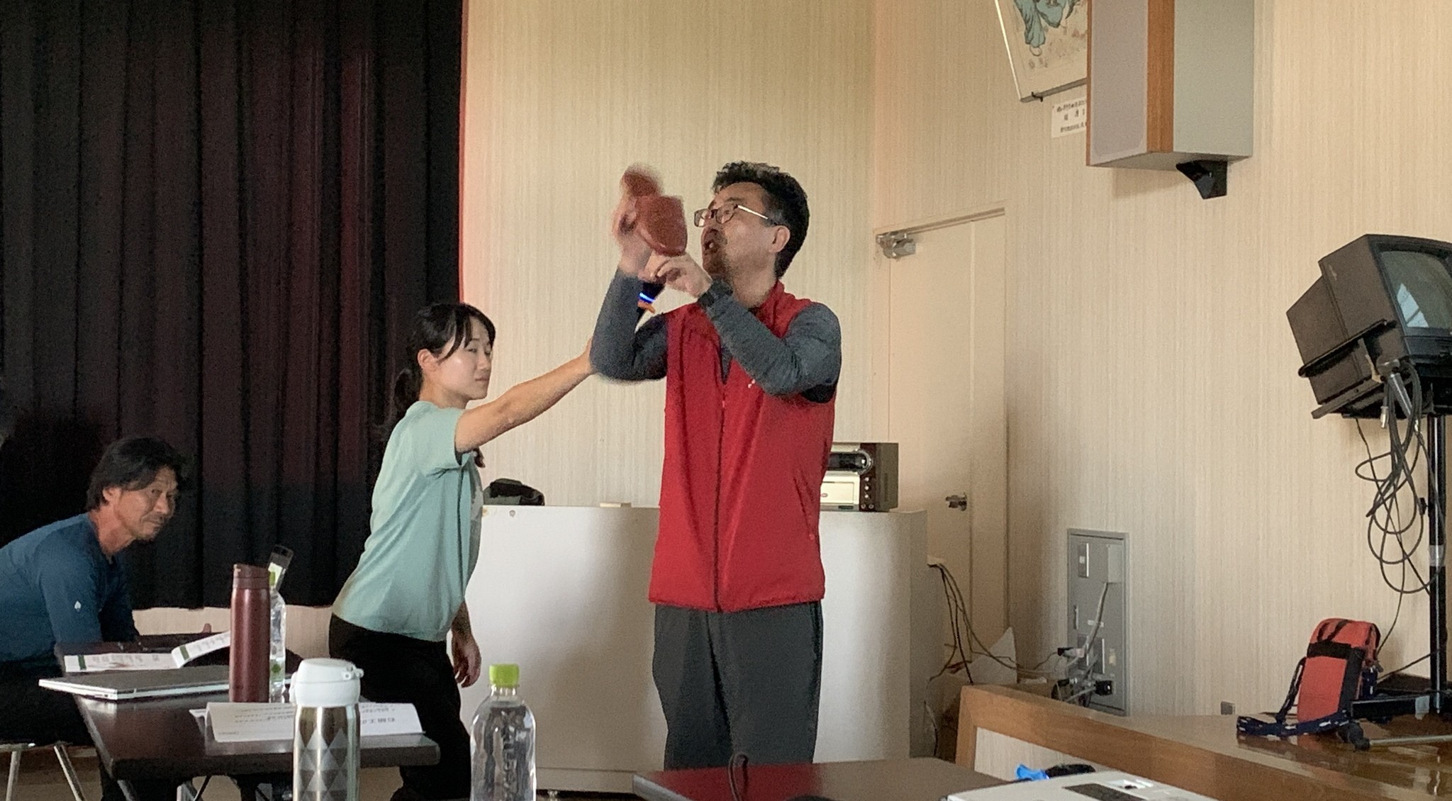 18日は、母子里コミュニティセンターにおいて、地元住民など30名以上が参加して、お二人の有識者による川のお話や翌日行う「石組み工による河川環境改善」の方法について勉強会を実施しました。