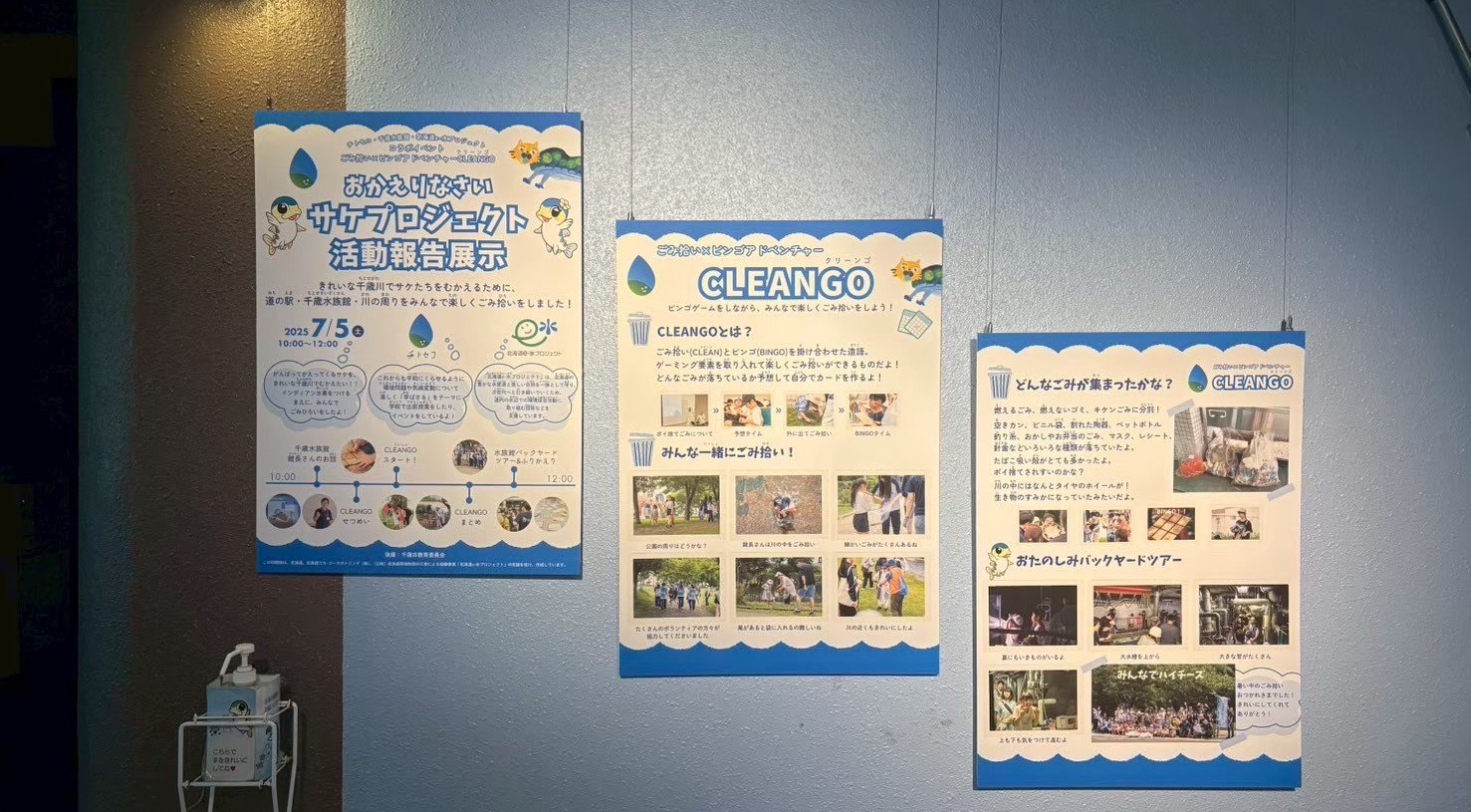 当日は、千歳水族館館長・菊池氏による講話、当団体による「ポイ捨てごみの行方」に関する話を行った後、段ボールで作成したBINGO用紙を使って「どんなごみが落ちているか」を予想。参加者は3チームに分かれ、約30分間のごみ拾いを行いました。回収後はごみの種類を全員で確認し、予想が当たればチェックをつけてBINGOを楽しみました。さらに、千歳水族館のバックヤードツアーや、ごみ拾いの振り返りワークショップを実施し、「サケに伝えたいこと」「ごみ拾いで気づいたこと」を書いて発表しました。