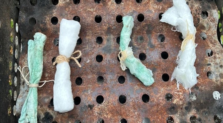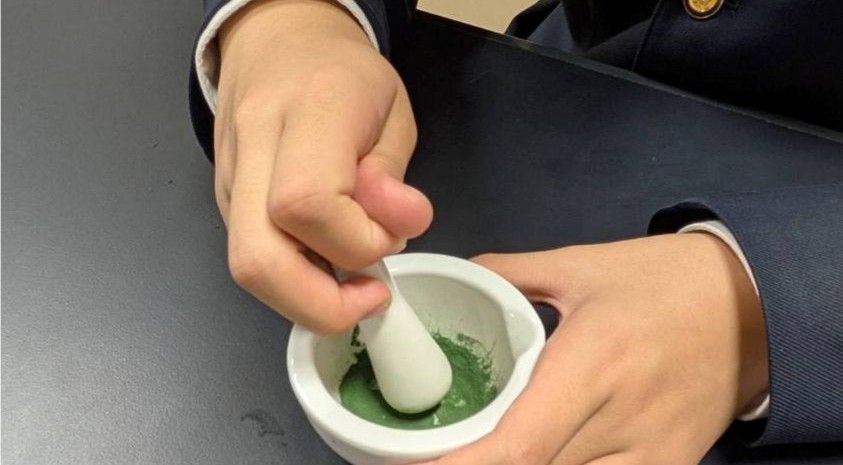アオコは、バットに流し乾燥させると、パリパリとした薄いフィルム状の物に変化します。それを私たちは乳鉢などで粉砕し、粉状のアオコを作りました。そのアオコ粉を用いて、クレヨンを作ってみましたが、油分が多すぎたのかうまく固めることができませんでした。こちらは、試料の配分などをもう少し改良する必要があると感じました。続いて、着火剤も作りました。ロボットボートによるアオコ回収はコットンに染み込ませて回収していましたが、そのアオコが染み込んだコットンは、廃棄処分になっていました。そこで先輩の代から、ただ捨てるのはもったいないとのことで、そのコットンを乾燥させ、ワセリンを塗って着火剤にできないかと研究していました。ワセリンの量が多いと20分以上燃えてしまうので、今年はワセリンの量を少なめにしたり、アオコが有るか無いかで燃焼時間に変化が見られるのかも実験したりしました。ワセリンの量を少なくすると12分ほどで燃え尽きるのがわかりました。また、アオコが有るか無いかの比較実験では、アオコがある方が長く燃えることがわかりました。しかし、アオコの無い方は真新しいコットンを使用したので、空気を多く含んでいるため早く燃えたのではと考え、今後は条件を同じにしてもう一度燃焼時間を比較する必要があると考えました。