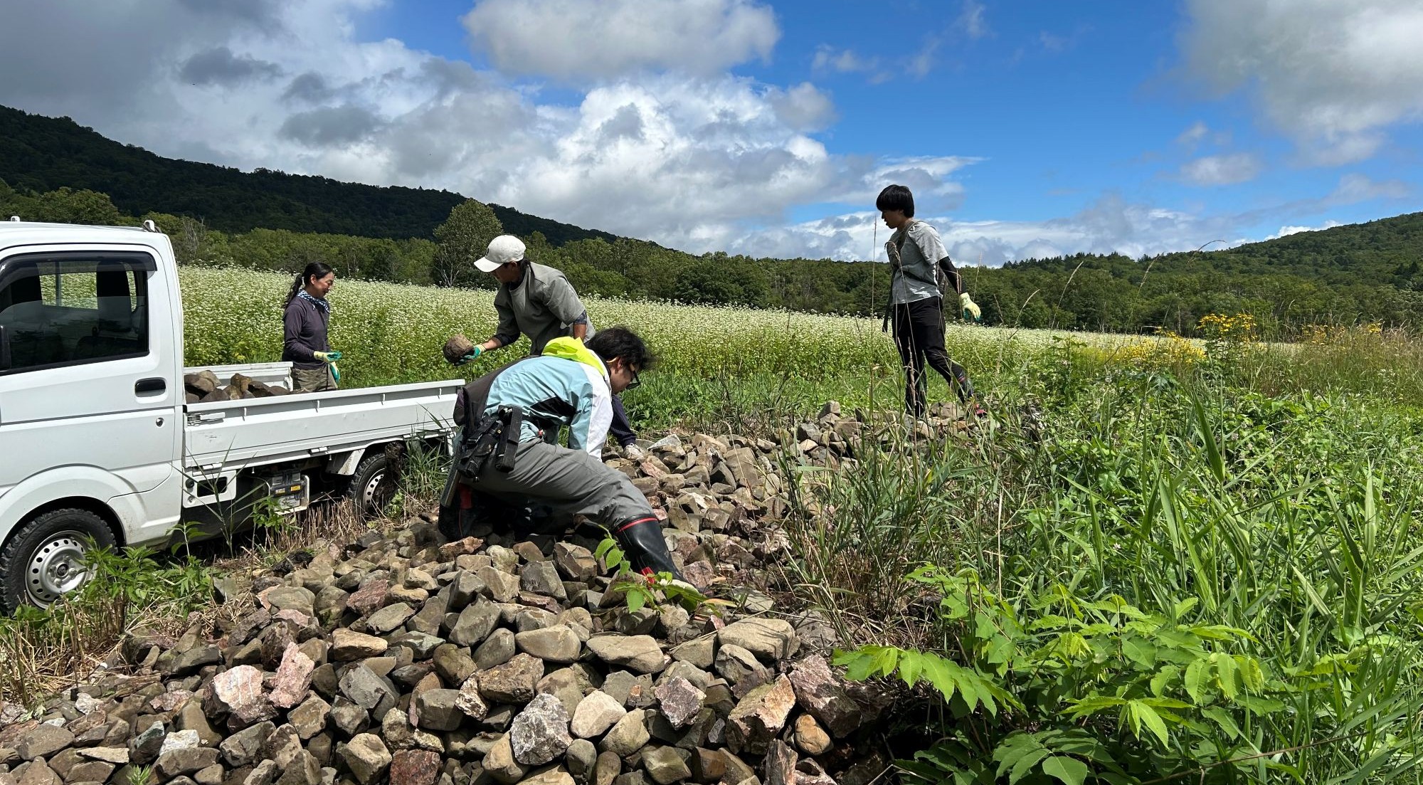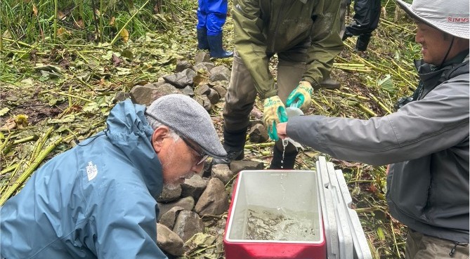 その後の現地作業では、地元農家が長年畑に置いていた石を活用し、横断構造を造成することで水深・流速・河床材料を多様化させ、イトウの休息場所や産卵環境となる空間を創出しました。施工後には、石組み周辺に稚魚のイトウを放流し、実際に石組みに泳ぎ込む様子が確認され、環境改善の効果が期待できる大きな成果となりました。参加者からは、身近な川が“きれいな飲み水の源”であるだけでなく、“魚が住める環境であることの大切さ”を実感できたという声が多く寄せられました。また、自らの手で自然再生に関わる喜びや、「畑の邪魔者」である石から「魚の棲家」へと生まれ変わる過程を共有したことで、住民同士のつながりや達成感を生むきっかけにもなりました。さらに、イトウという象徴種の価値を再認識することが、地域の自然環境の維持管理や将来の資源利用を考える契機にもなりました。