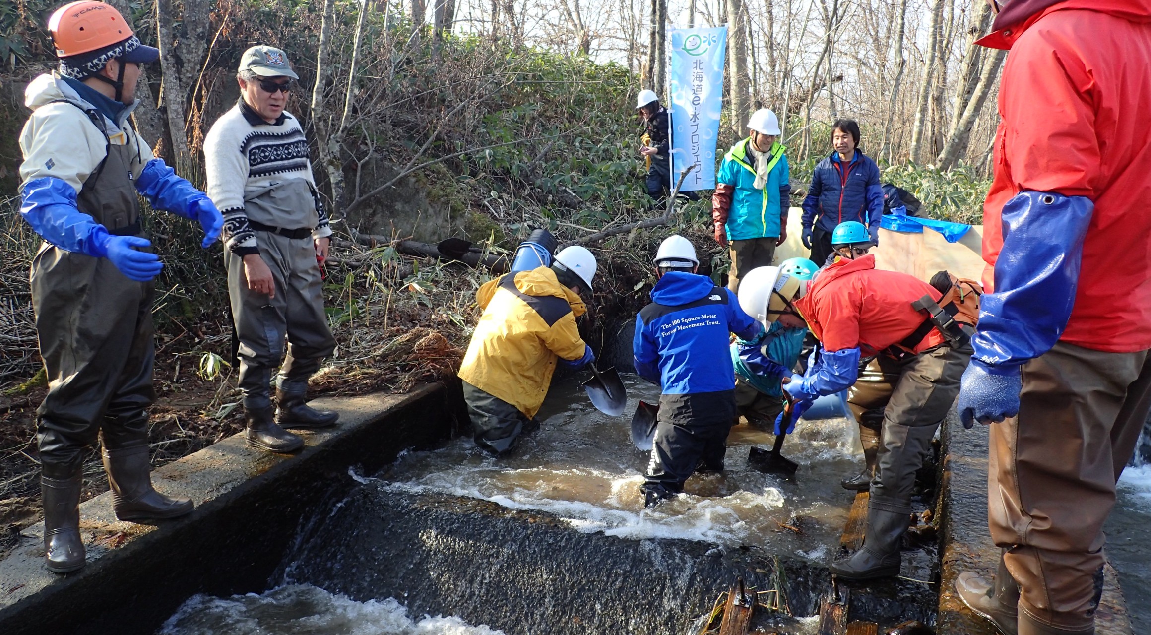 川での作業に地元の子供たちや市民グループに参加してもらえるよう、中標津町や地元関係者の協力のもとで参加を呼びかけました。約50名で実施できる運びでしたが、当初の実施予定日が大雨となり、日程を延期せざるを得なくなりました。そのため残念ながら参加者が減り、予定していた石倉作りの規模も小さくなりましたが、それでも効果的な対策を施すことができました。既設魚道内のスロープを修復するとともに、大型の石を積み上げ、底生魚や水棲生物の増加と定着を図りました。