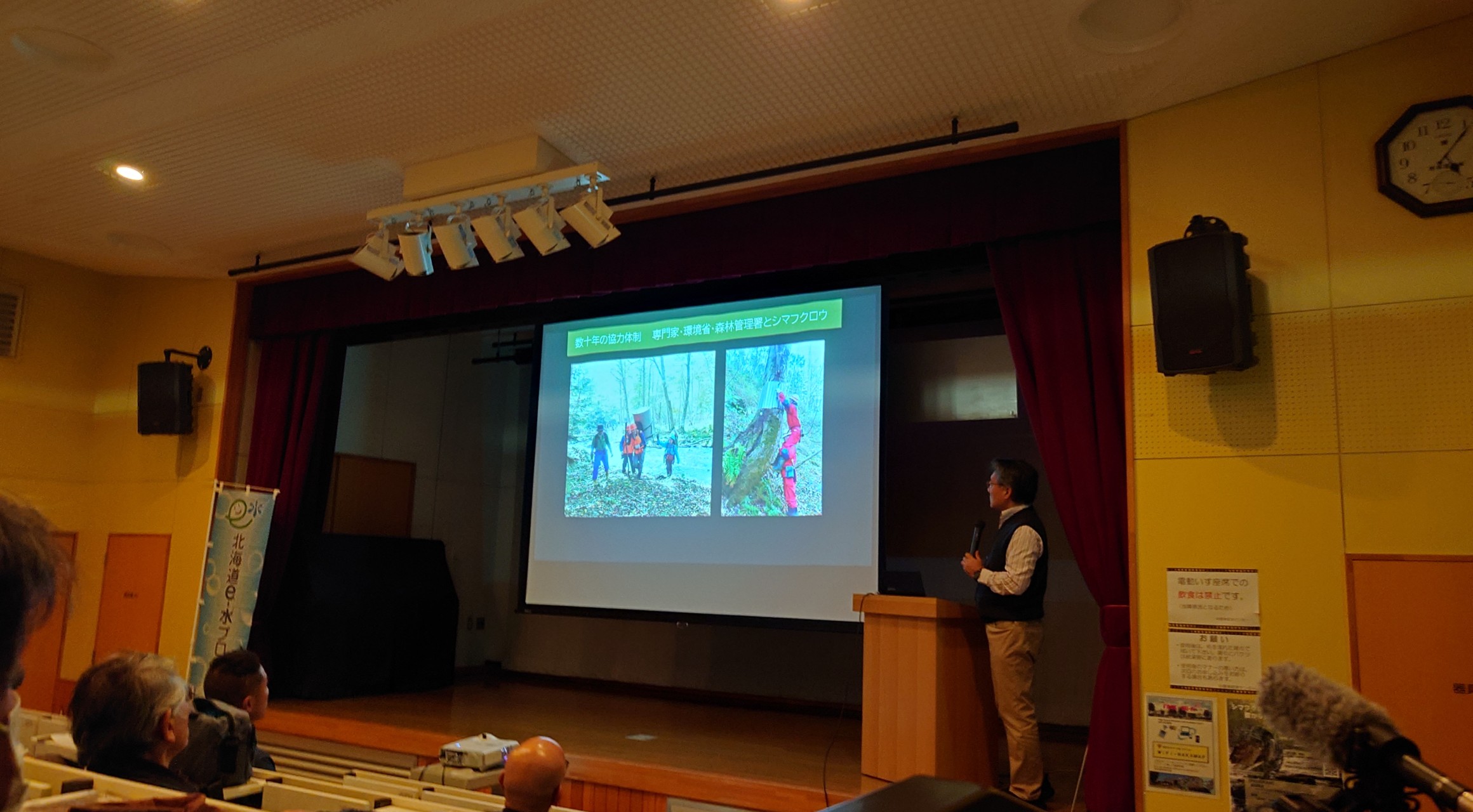 さらに標津川流域の広い範囲で生物多様性保全を進めていけるよう、地域連携を図る協議・意見交換の場を設けました。11月には中標津町で市民フォーラムも開催しました。専門家によるシマフクロウの生態や行動、標津川に生息する魚類層等についての講演ともに、中標津町や標津町の自然保護の現状や課題、格子状防風林の存在意義や、近年注目されているメガソーラー問題、自然共生サイトの紹介といった話題提供がありました。